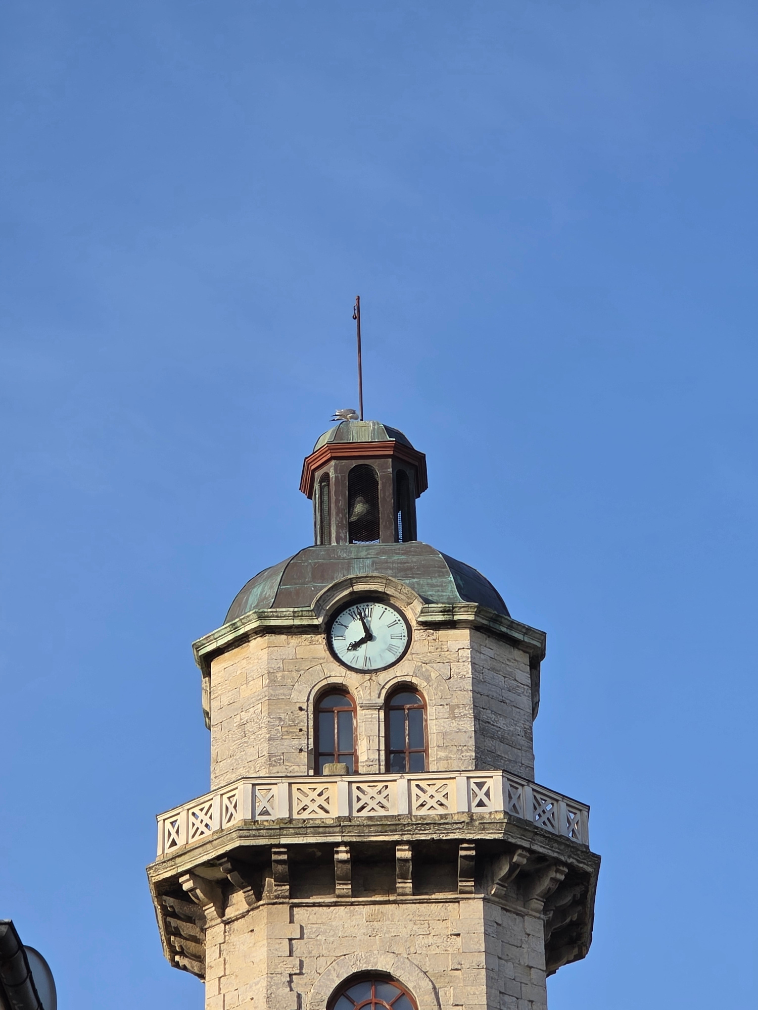 The image is a low-angle shot of the Saint Athanasius Church clock tower in Varna, Bulgaria, set against a clear blue sky. The tower is constructed of light-colored stone and features a clock face on…read more