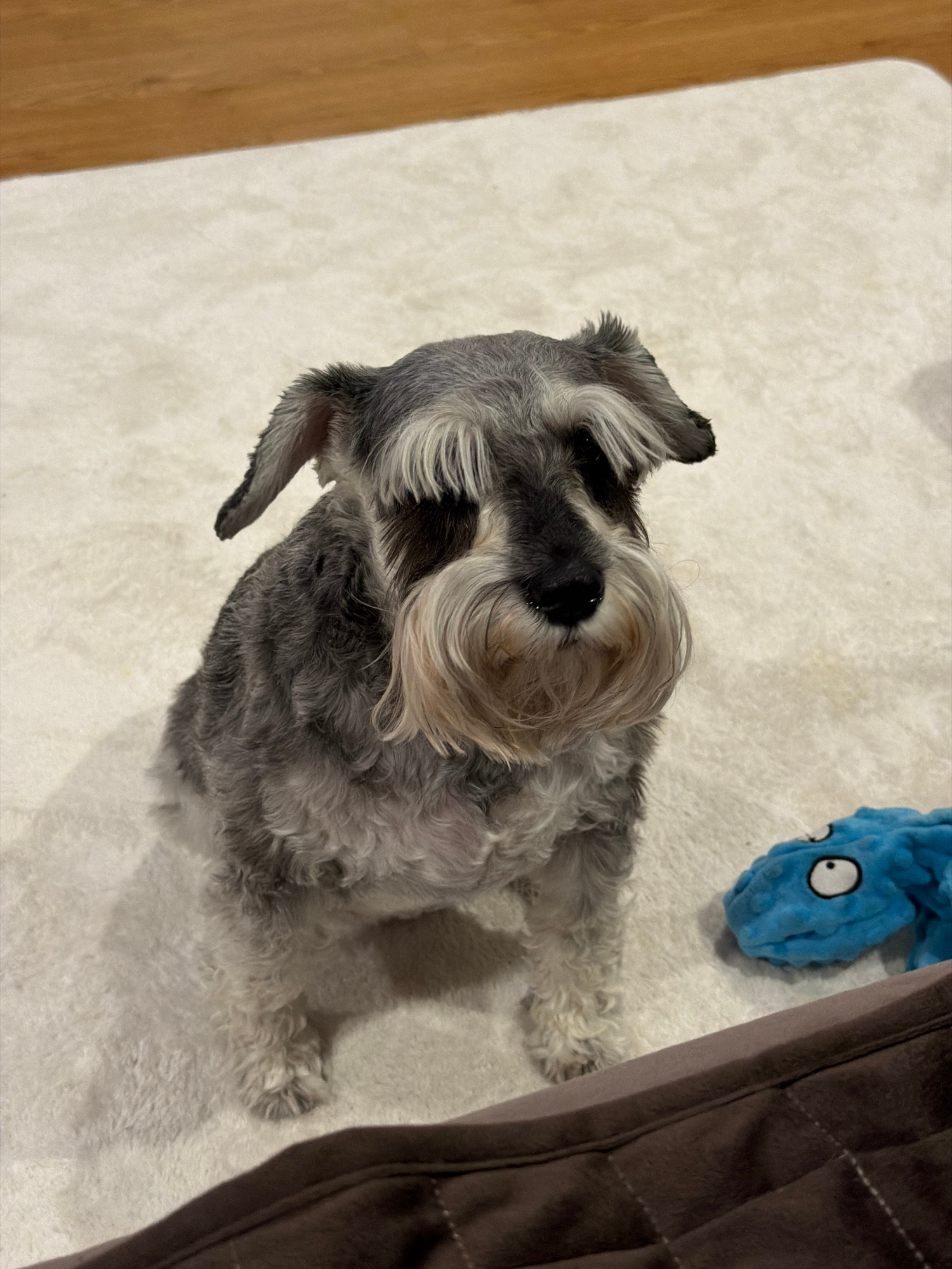 A gray and white miniature schnauzer dog lies on a white, textured rug, next to a brown cushion. A blue, soft toy with large white eyes is also near the dog. The scene is indoors, with a wooden floor…read more
