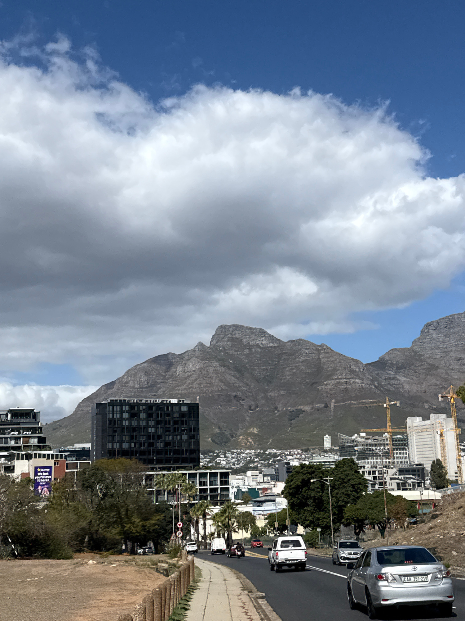 The image depicts a view in Cape Town, South Africa, featuring Table Mountain in the background. A mix of buildings, including modern high-rises and smaller structures, are situated along the mountain…read more