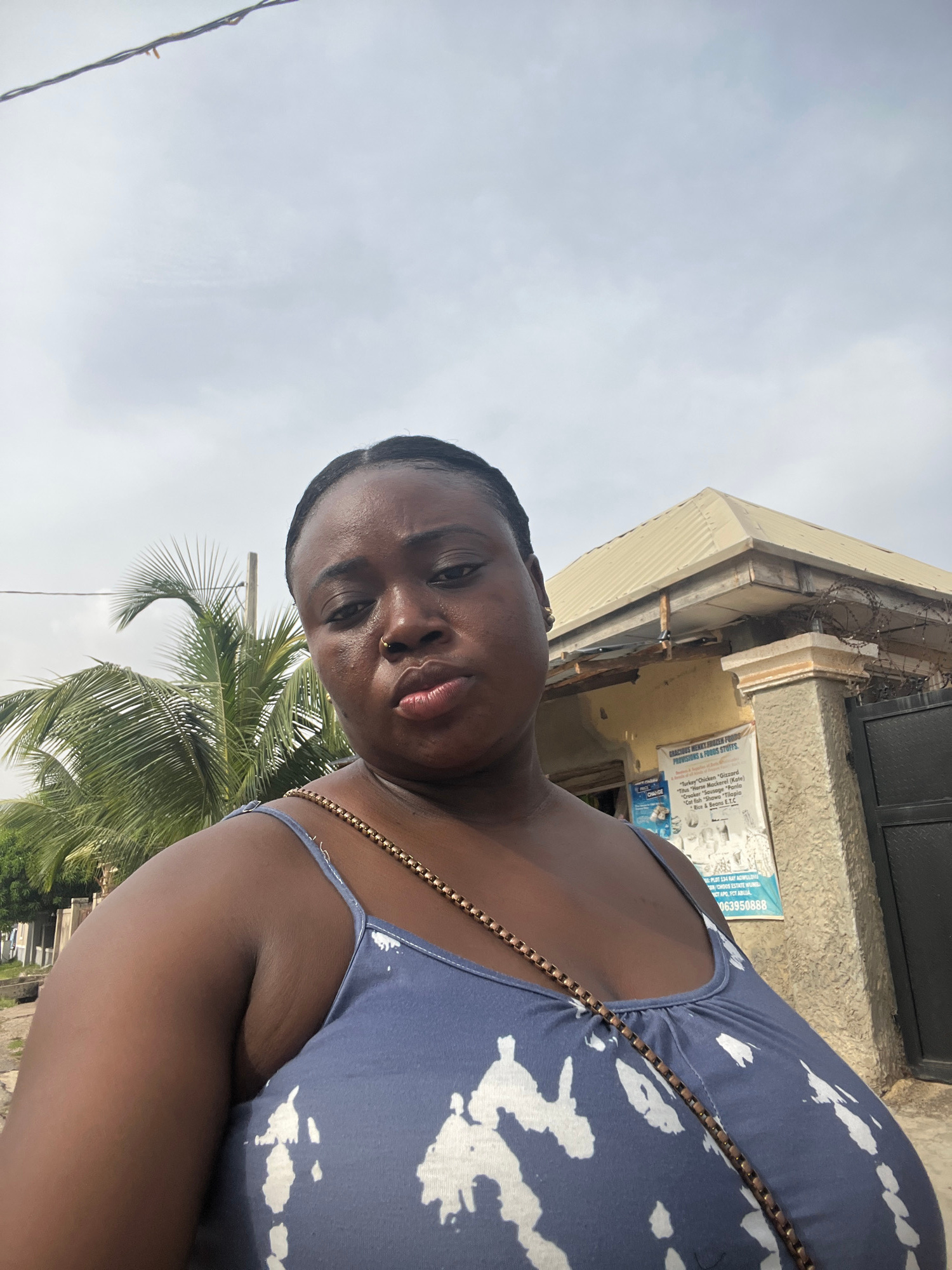 A dark-skinned woman in a blue and white patterned tank top is positioned in the foreground of an outdoor shot. The woman has a nose ring. The background shows a building with the sign of "GRACIOUS ME…read more