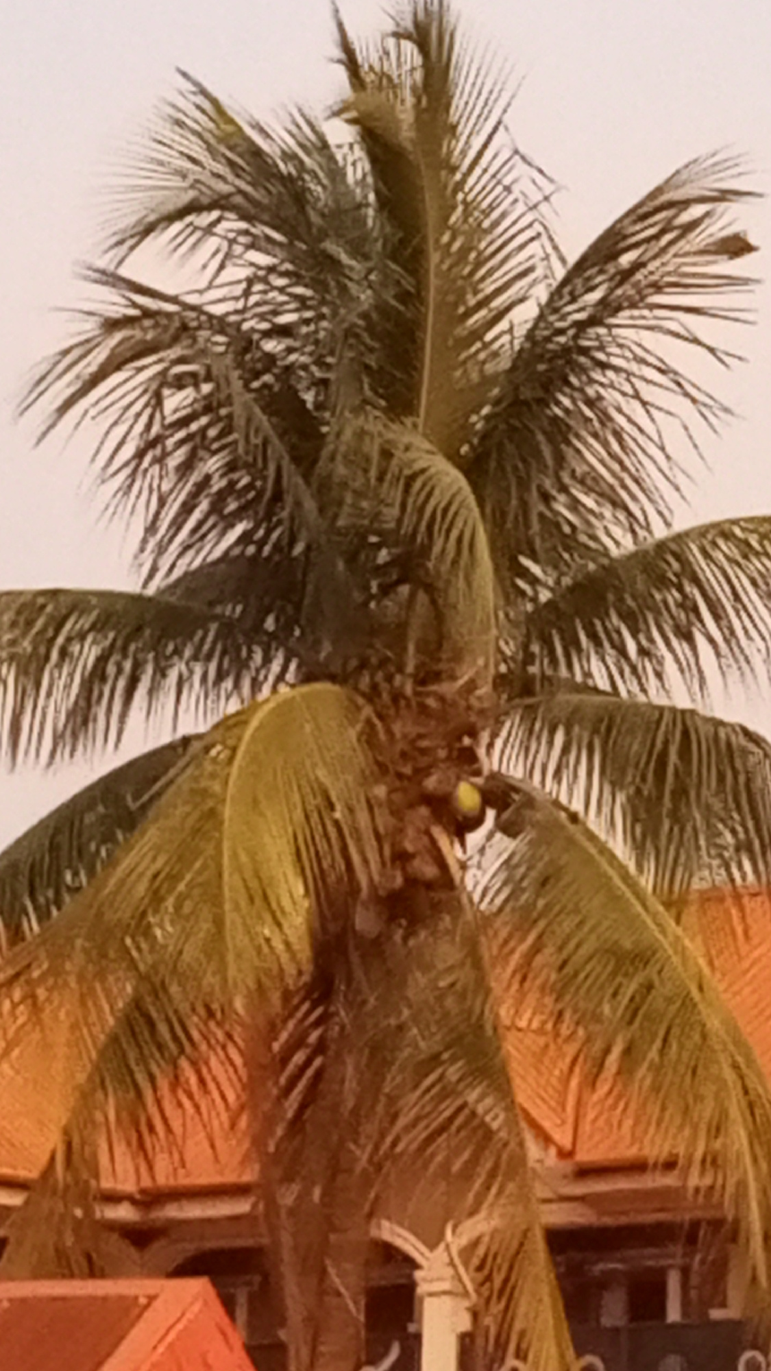 The image features a tall coconut palm tree, its green fronds reaching towards the sky. A few coconuts are visible hanging from the tree's trunk. In the background, sections of buildings with red or o…read more