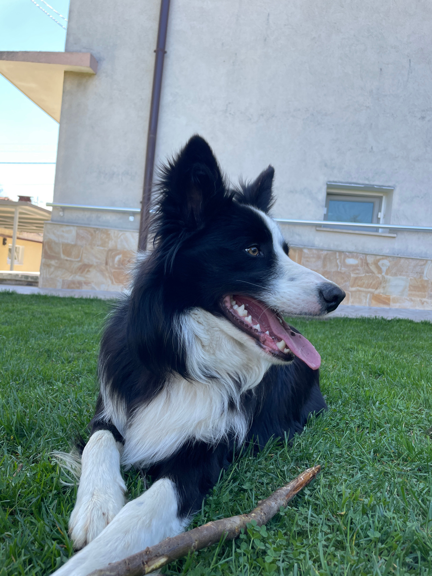 A black and white Border Collie dog lies on green grass in an outdoor location. The dog is panting with its tongue out. Next to the dog is a wooden stick. In the background, there is a cream-colored b…read more