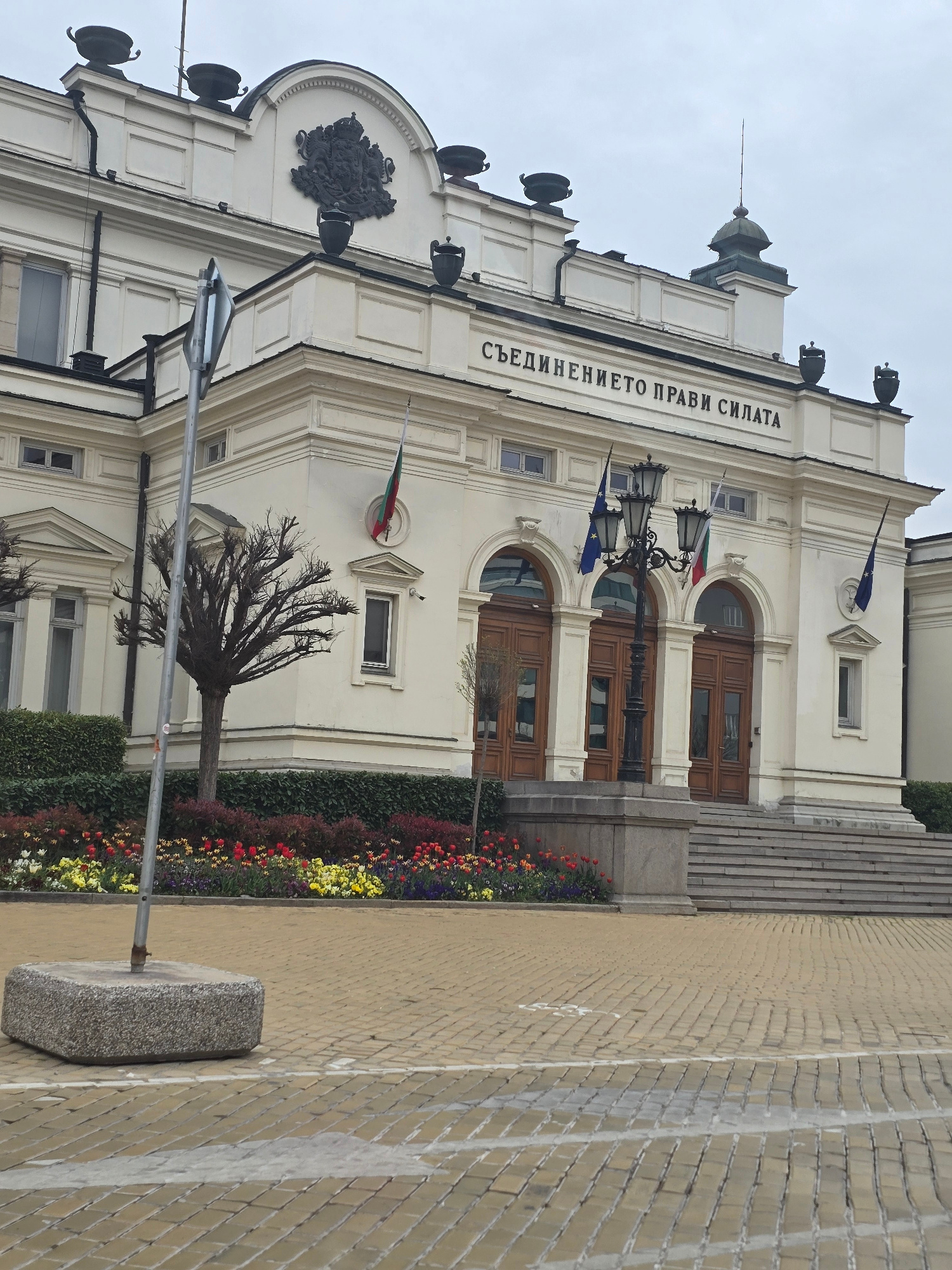 The image captures a low-angle shot of the National Assembly of Bulgaria building in Sofia. The building is white with dark brown doors and windows. The facade displays the inscription "Съединението п…read more
