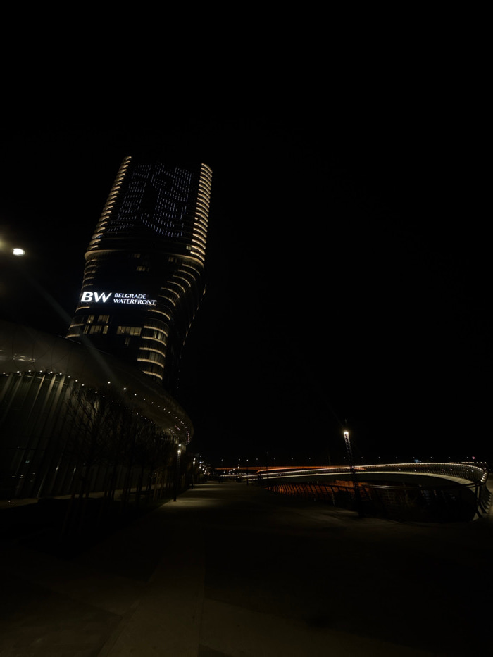 The image displays an urban waterfront scene at night, specifically located at the Belgrade Waterfront development in Belgrade, Serbia. The dominant feature is the Kula Belgrade (Belgrade Tower) skysc…read more
