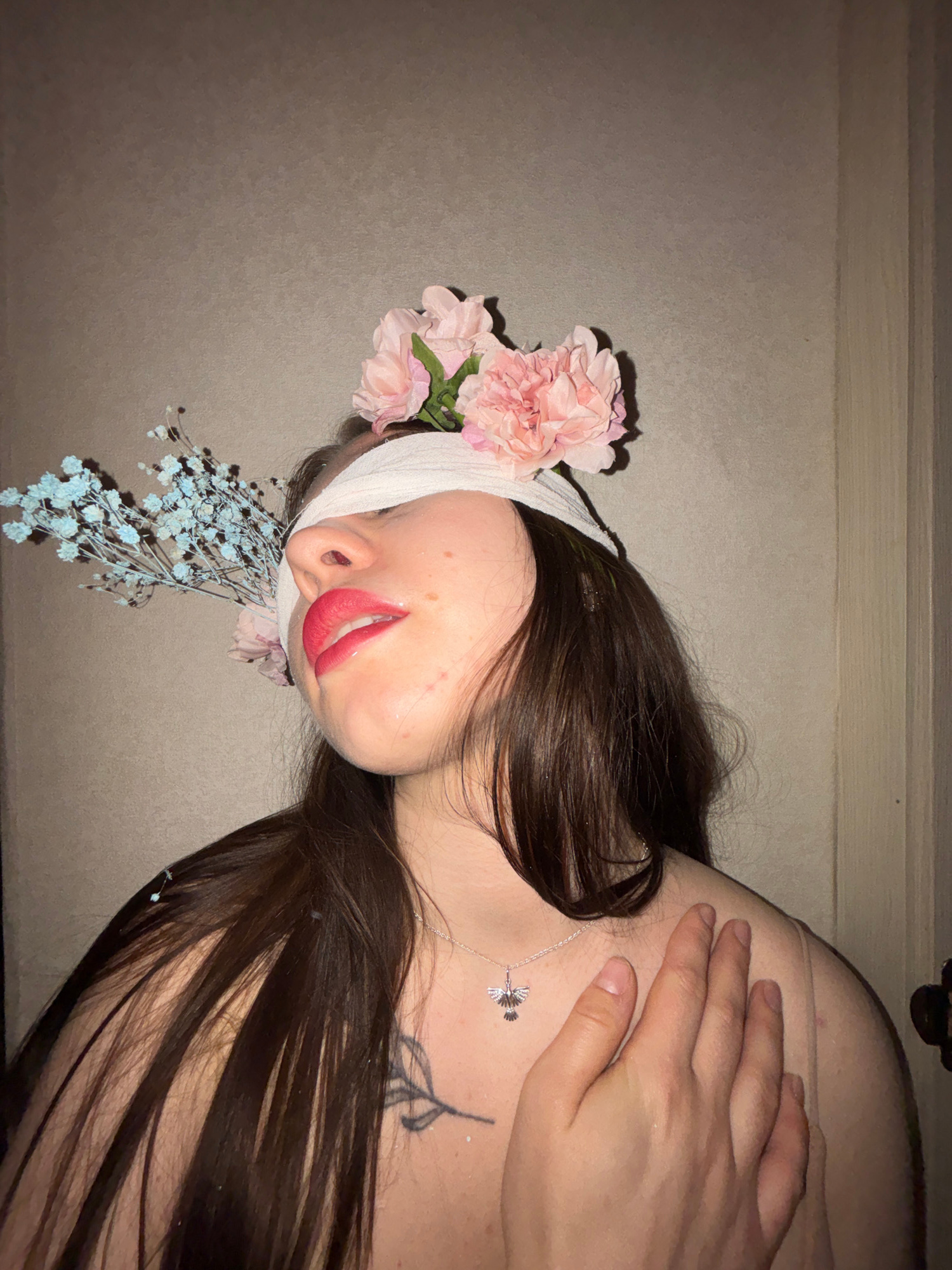 A close-up portrait shows a person, likely female, from the chest up, lying down with their head tilted slightly. They have long, dark brown hair spread around their head and shoulders. A white or off…read more
