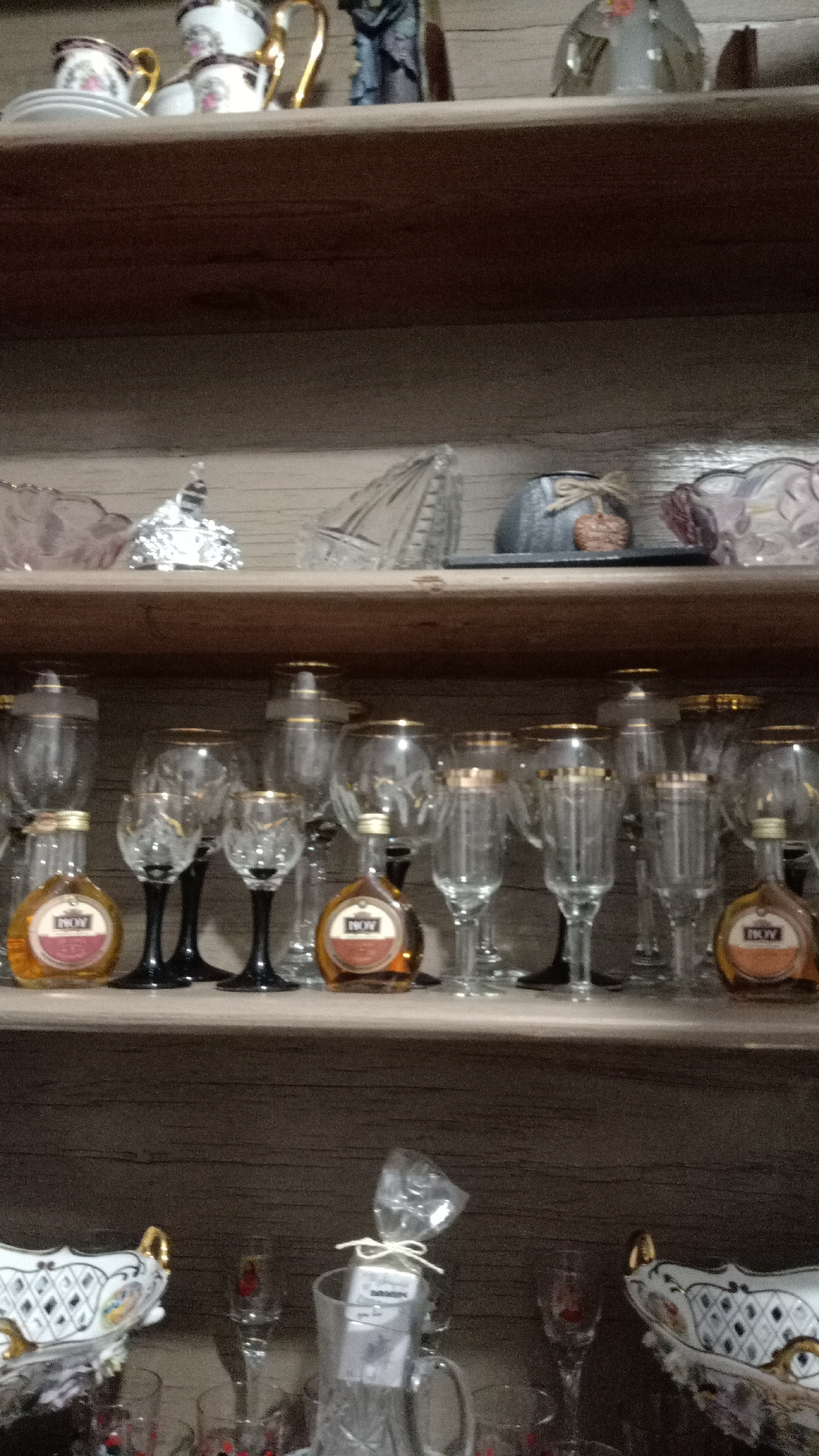 The image shows a wooden shelf containing various glassware and decorative objects. On the top shelf, there are teacups and saucers, along with other decorative items. The second shelf holds glass bow…read more
