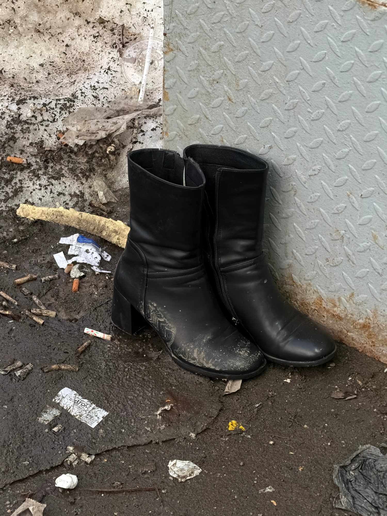 The scene depicts a pair of black, mid-calf women's boots with chunky heels and interior zippers, positioned upright against a light gray diamond-plate metal surface. The immediate ground consists of…read more