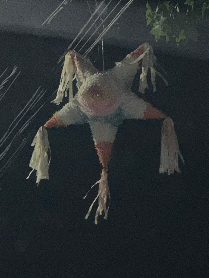 The image displays a star-shaped piñata suspended outdoors at night in Mexico City, Mexico. The piñata features a central body with seven points, five prominent and two smaller ones. It is primarily c…read more
