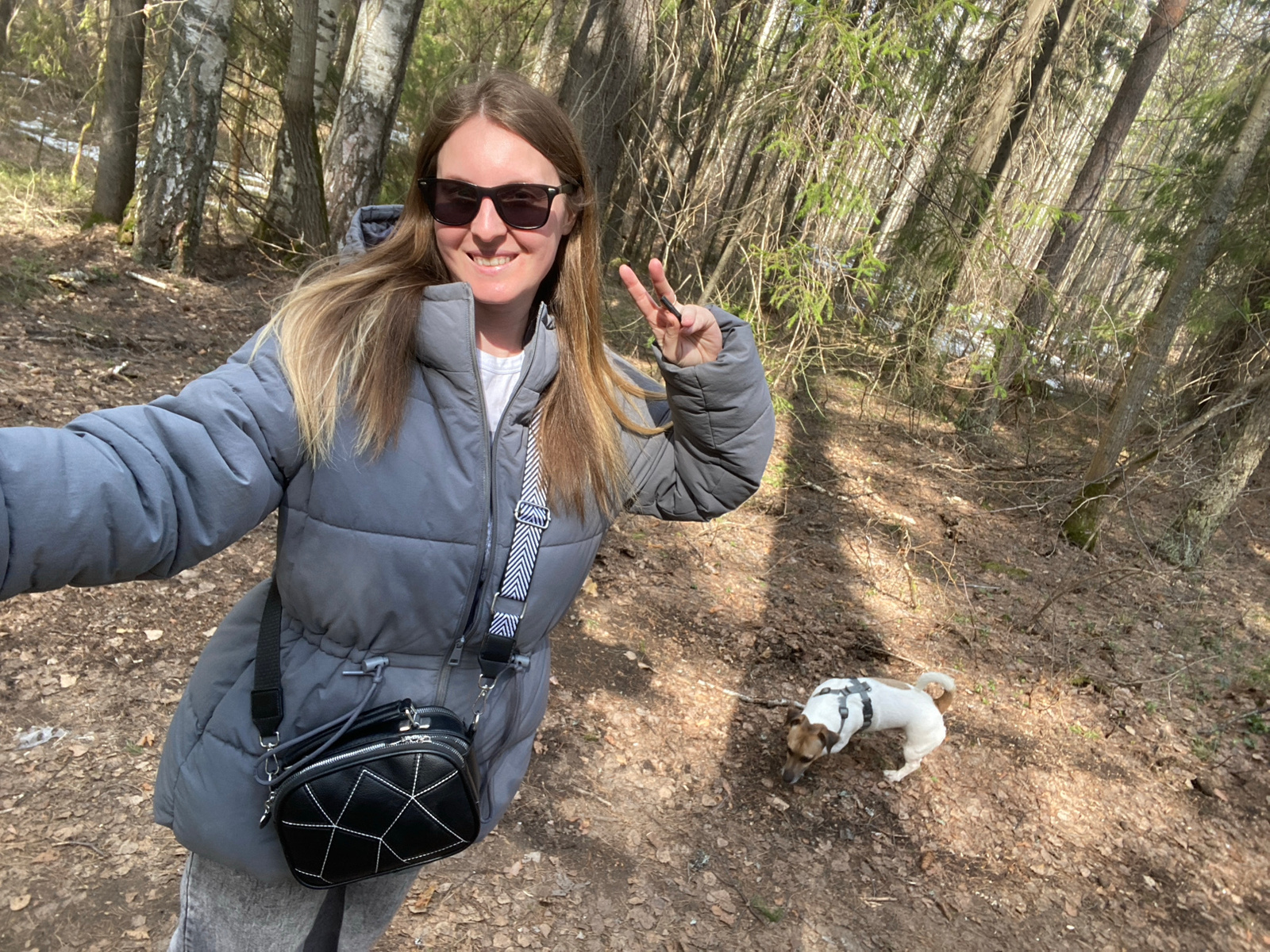 A woman wearing a gray puffer jacket, sunglasses, and a black purse with a patterned strap is taking a selfie in a forest. She is holding up a peace sign. A small, white and brown dog wearing a harnes…read more