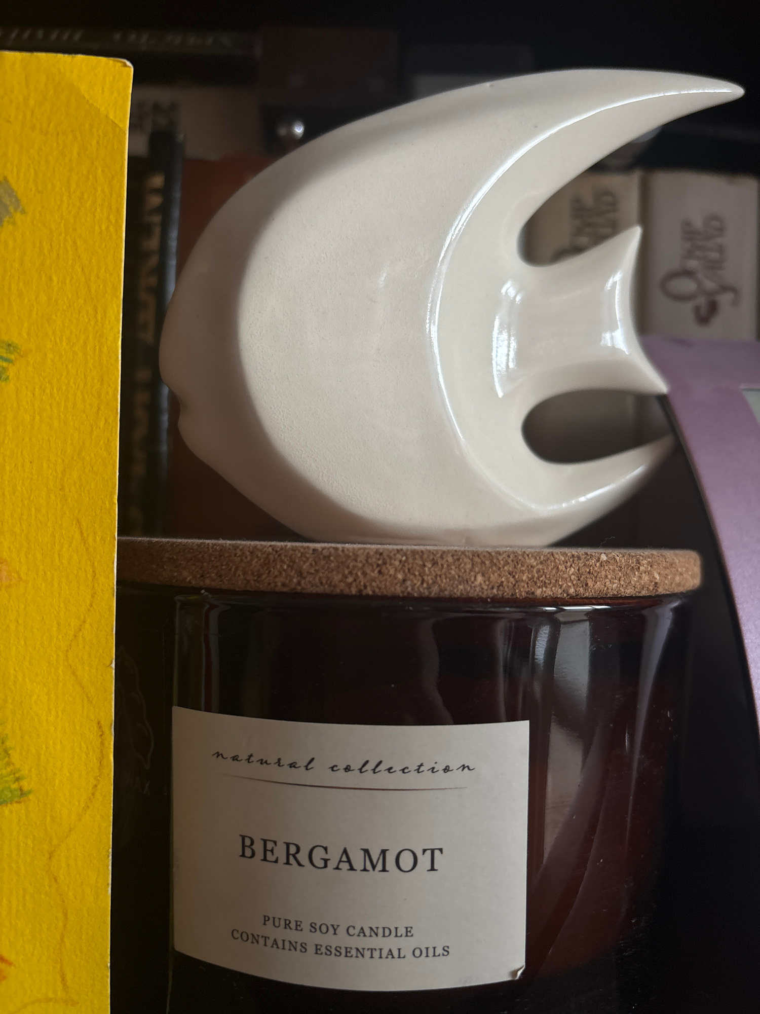 A close-up shot reveals a complex arrangement of objects. A white, ceramic object resembling a stylized bird is positioned next to a dark brown glass jar with a tan cork top. The jar has a white label…read more