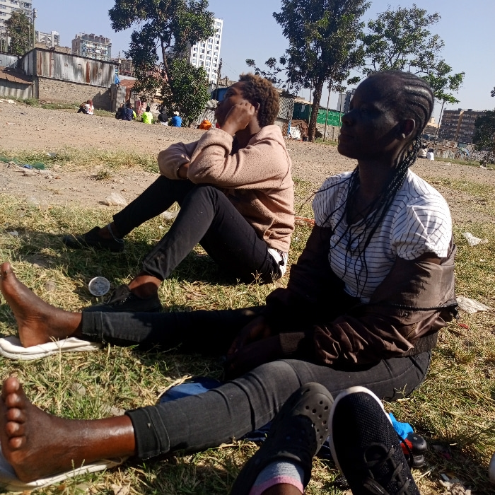The scene depicts two individuals seated on a sparse dirt and grass patch under a clear, sunny sky, characteristic of an informal settlement bordering a developed urban area in Nairobi, Kenya. In the…read more