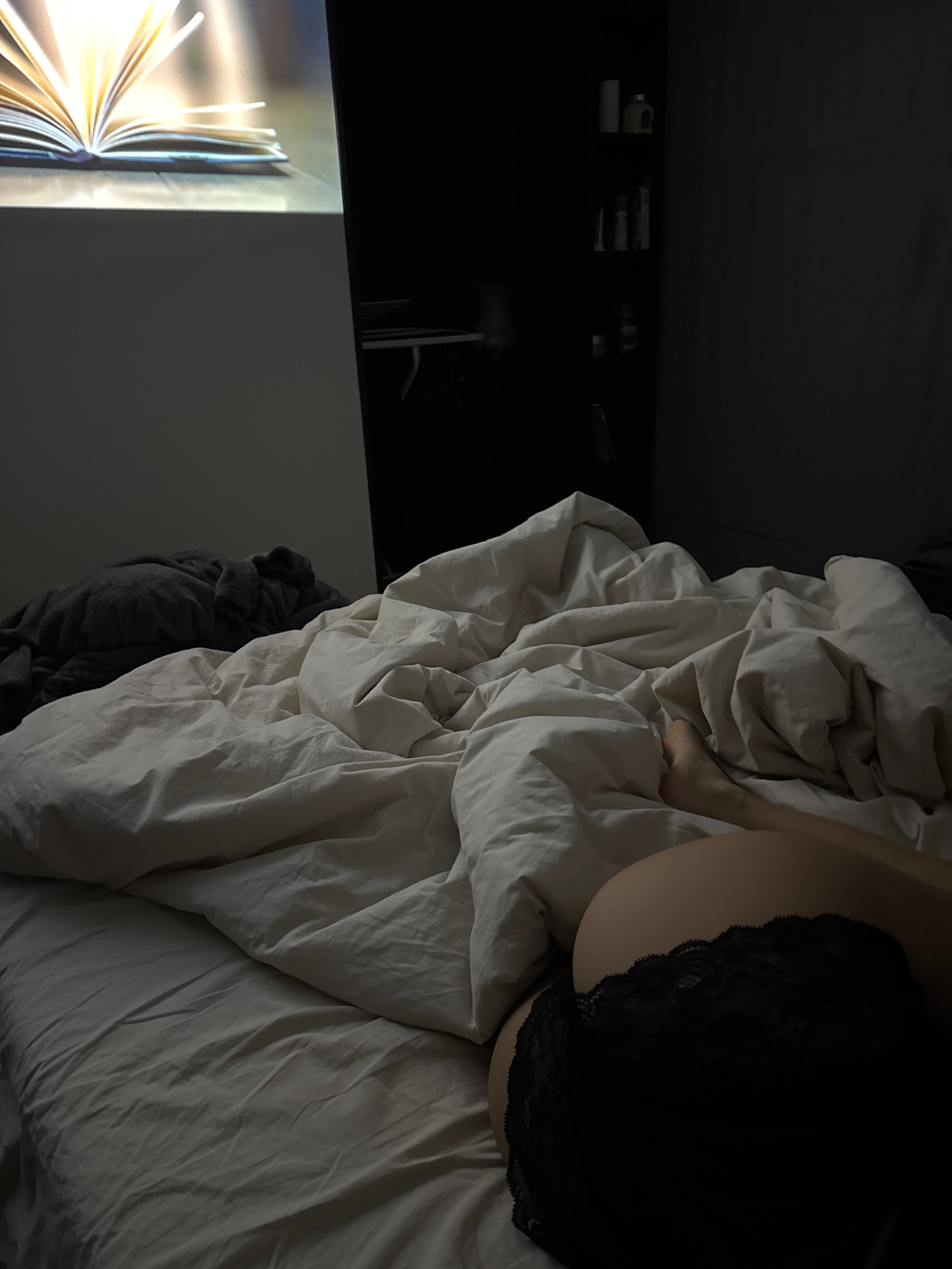 A dimly lit, tilted, close-up shot focuses on a bed with rumpled white sheets. A person wearing black lace underwear is lying on the bed. To the left of the bed is a dark area containing an entertainm…read more