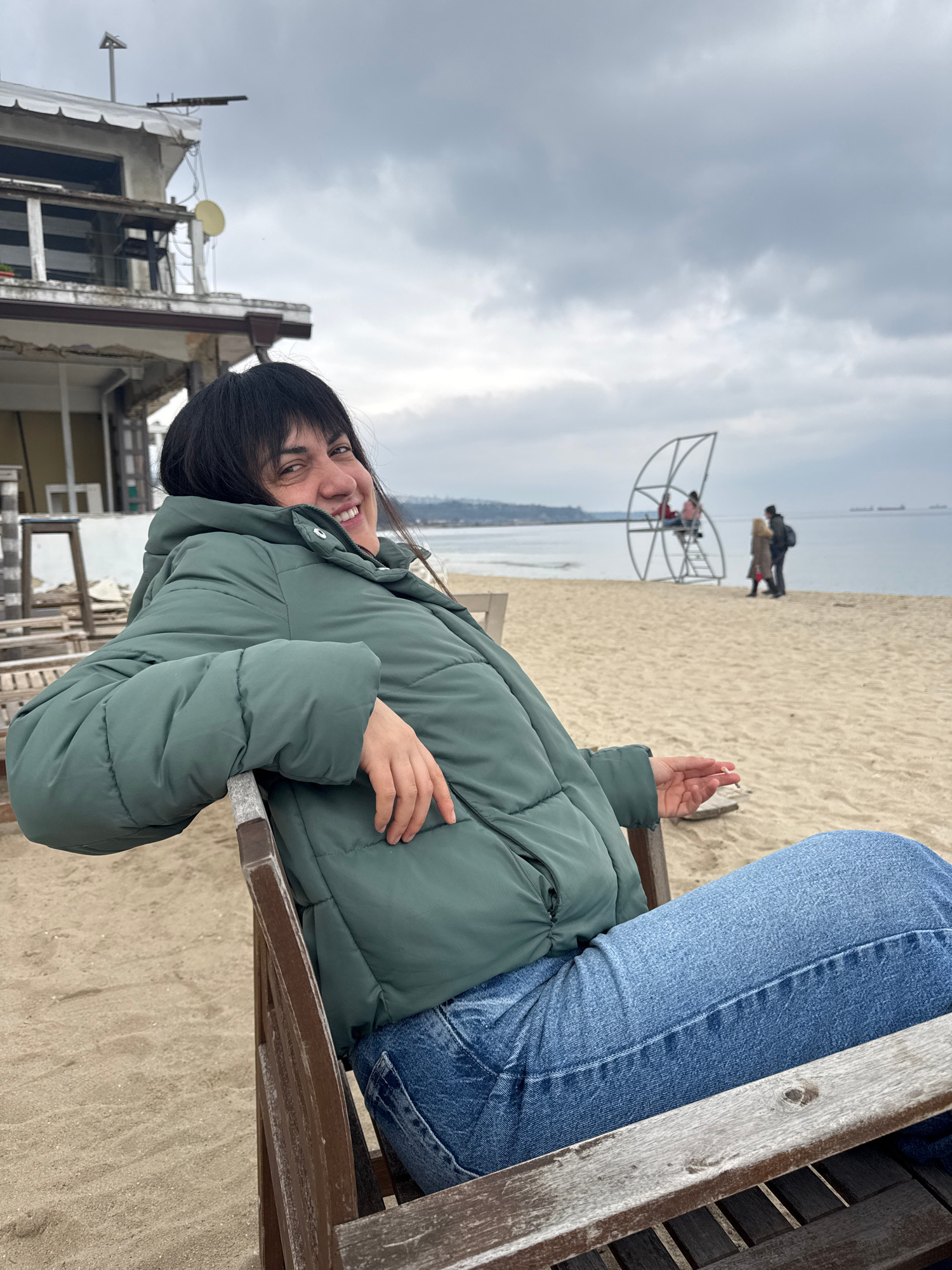 A medium shot shows a person reclining in a wooden beach chair on a beach in Varna, Bulgaria. The person is wearing blue jeans and a green puffer jacket and is smiling at the camera. The overcast sky…read more