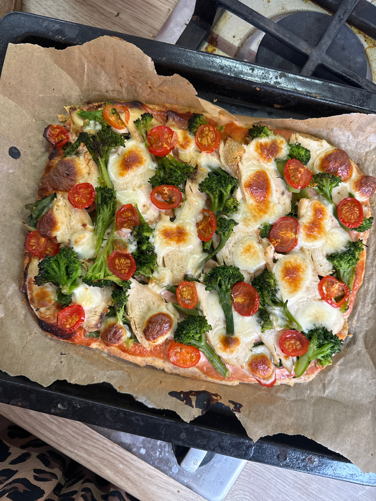 A rectangular pizza on a baking sheet is positioned next to a gas stovetop. The pizza has a browned crust and is topped with tomato sauce, mozzarella cheese, broccoli florets, and sliced cherry tomato…read more