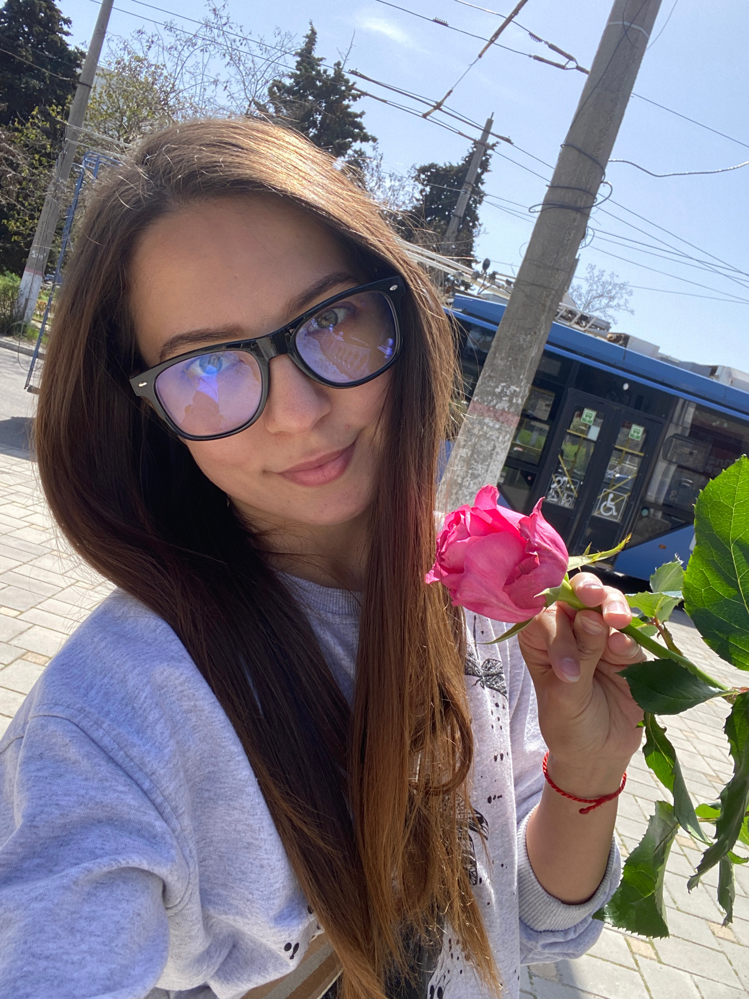 A young woman is posing with a pink rose near a public transit bus in Sevastopol, Ukraine. She is wearing glasses and a light gray sweatshirt. Her dark hair is parted to the side. She is holding the r…read more