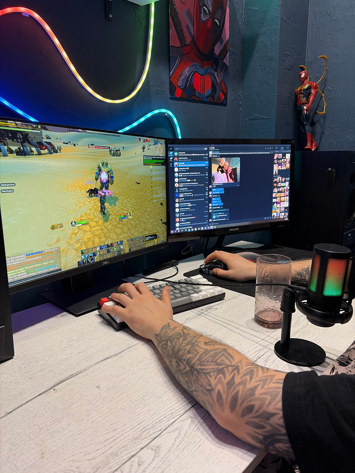 Here is a detailed description of the image: **Scene:** The image shows a setup typically used for gaming or online communication, likely in a home environment. **Objects:** * Two monitors are sta…read more