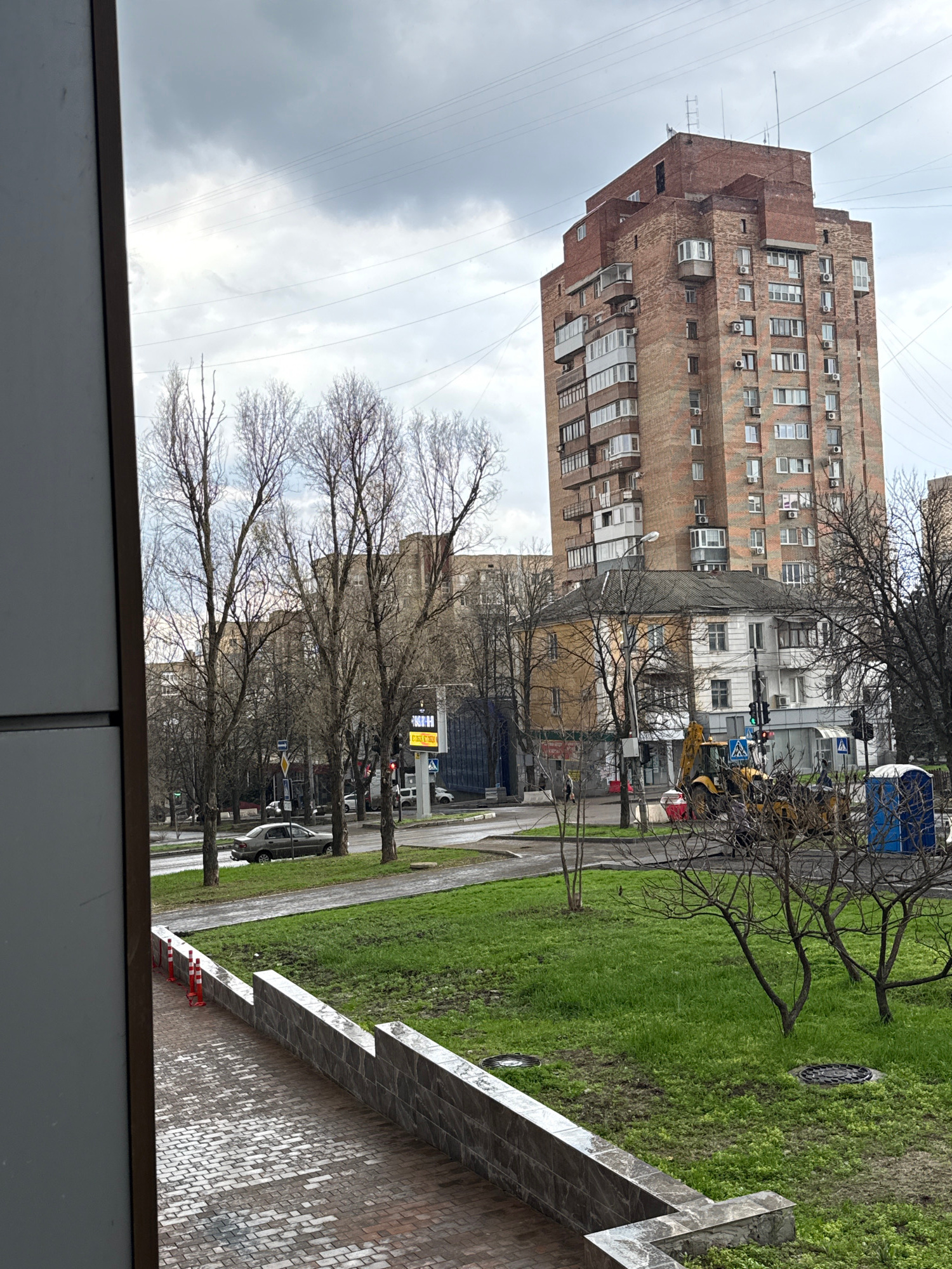 The image depicts an urban scene in Donetsk, Ukraine, with a view from an elevated position. A tall, Soviet-era apartment building constructed of brown brick dominates the upper left portion of the fr…read more