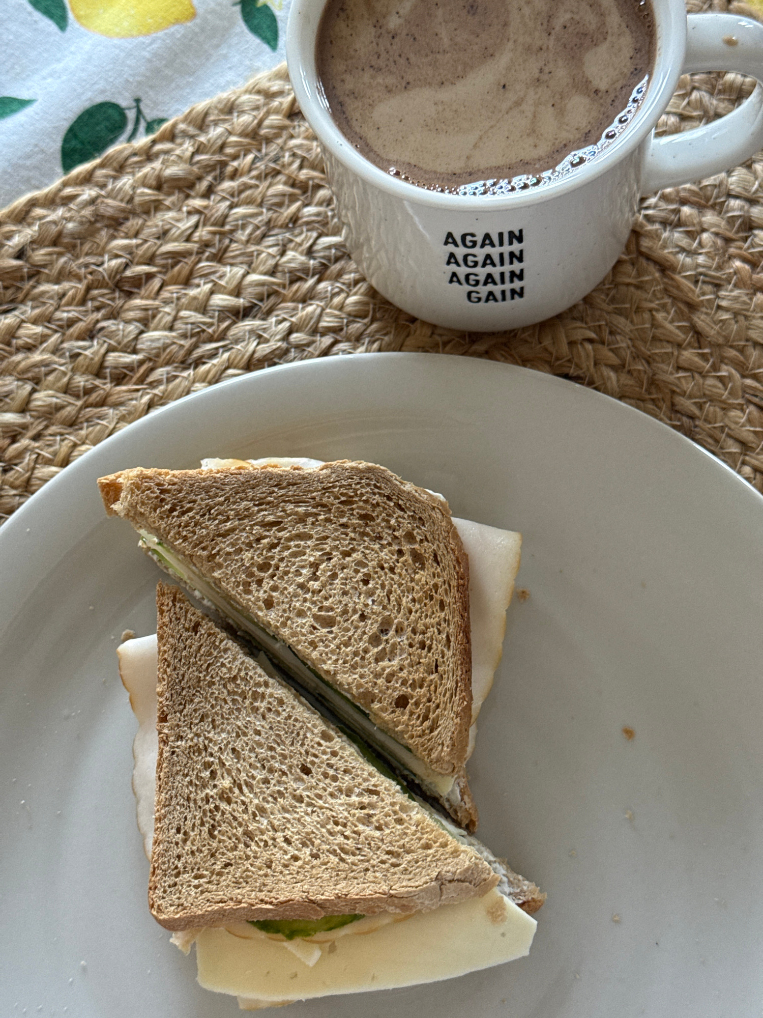 A top-down shot shows a mug of coffee next to a sandwich cut in half on a white plate, resting on a woven mat. A tablecloth with a lemon pattern is visible in the lower left corner. The mug is white w…read more