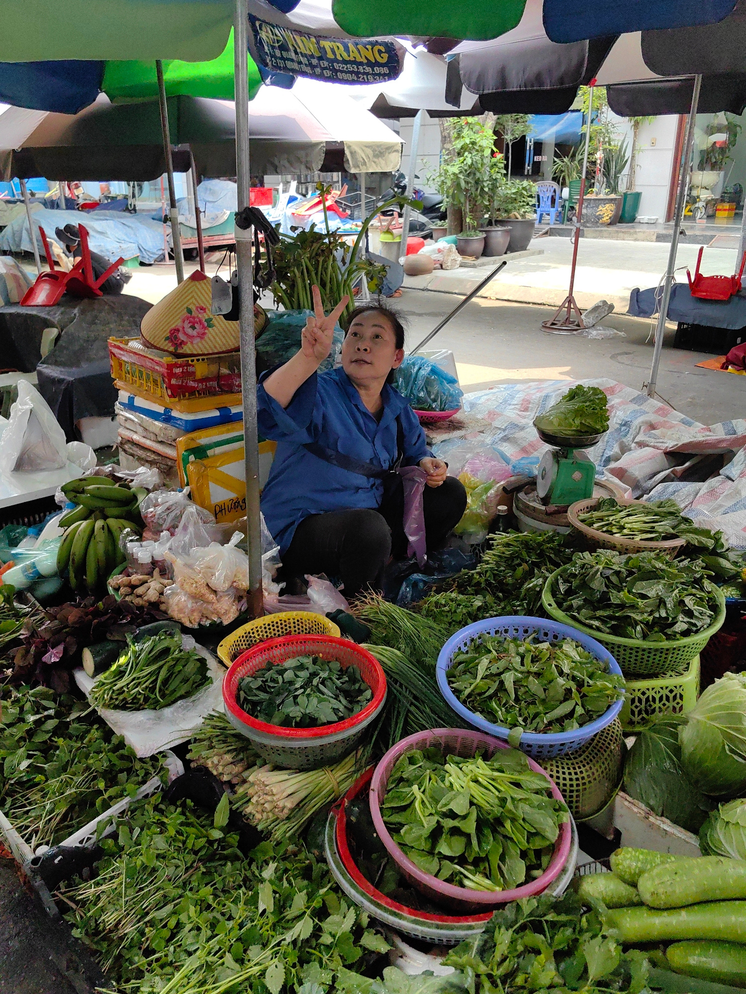 A woman crouches on a tarp surrounded by baskets and piles of fresh produce, likely at a market in Ha Long Ward, Vietnam. She is wearing a blue shirt and black pants and holds up two fingers in a peac…read more