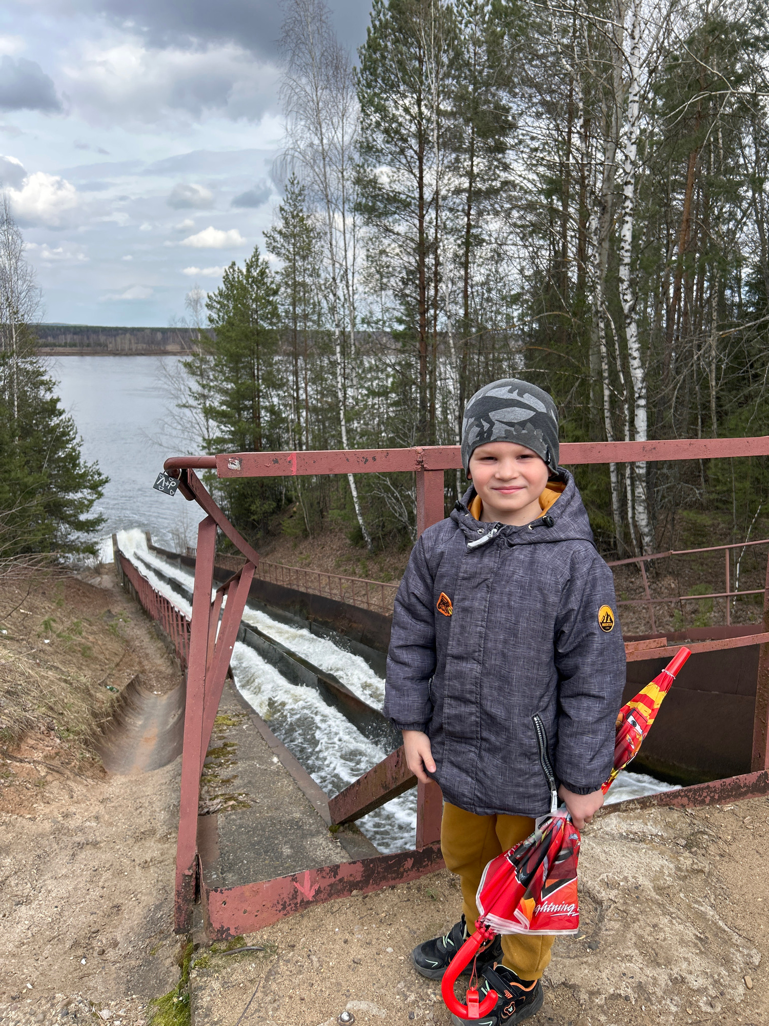 A child wearing a gray patterned jacket, a camouflage patterned hat, and mustard-colored pants is standing on a concrete structure, likely a dam or a bridge, overlooking a body of water with a series…read more