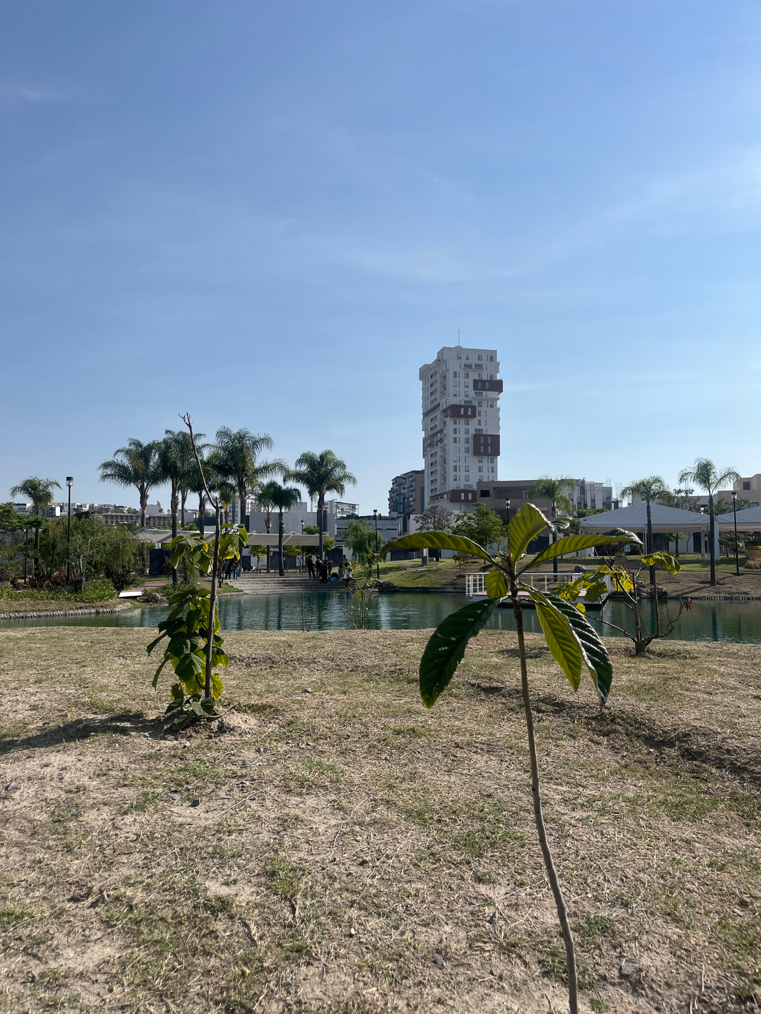 The image depicts a park in an urban environment. The foreground is characterized by a grassy area with young trees planted sporadically. A water feature, possibly a pond or canal, runs through the ce…read more