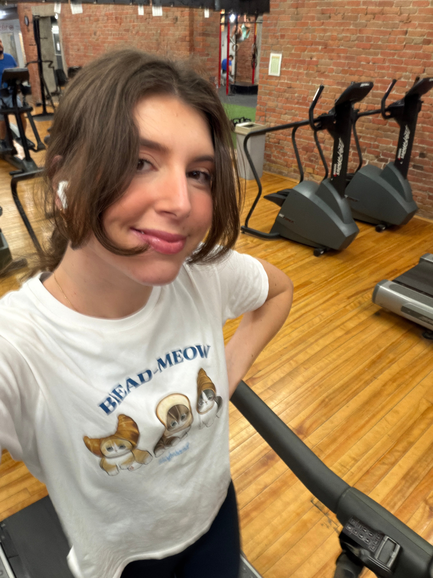 A young woman with brown hair and a white t-shirt featuring cartoon cats in the shape of bread or croissants is posing for a selfie. She is standing on a treadmill in a gym, holding onto the handrail. Other gym equipment, including treadmills and an exercise machine, are visible in the background. The gym has a brick wall and hardwood floors. There is no information in the image to specifically locate this gym within Montreal, Canada. | Open Wire