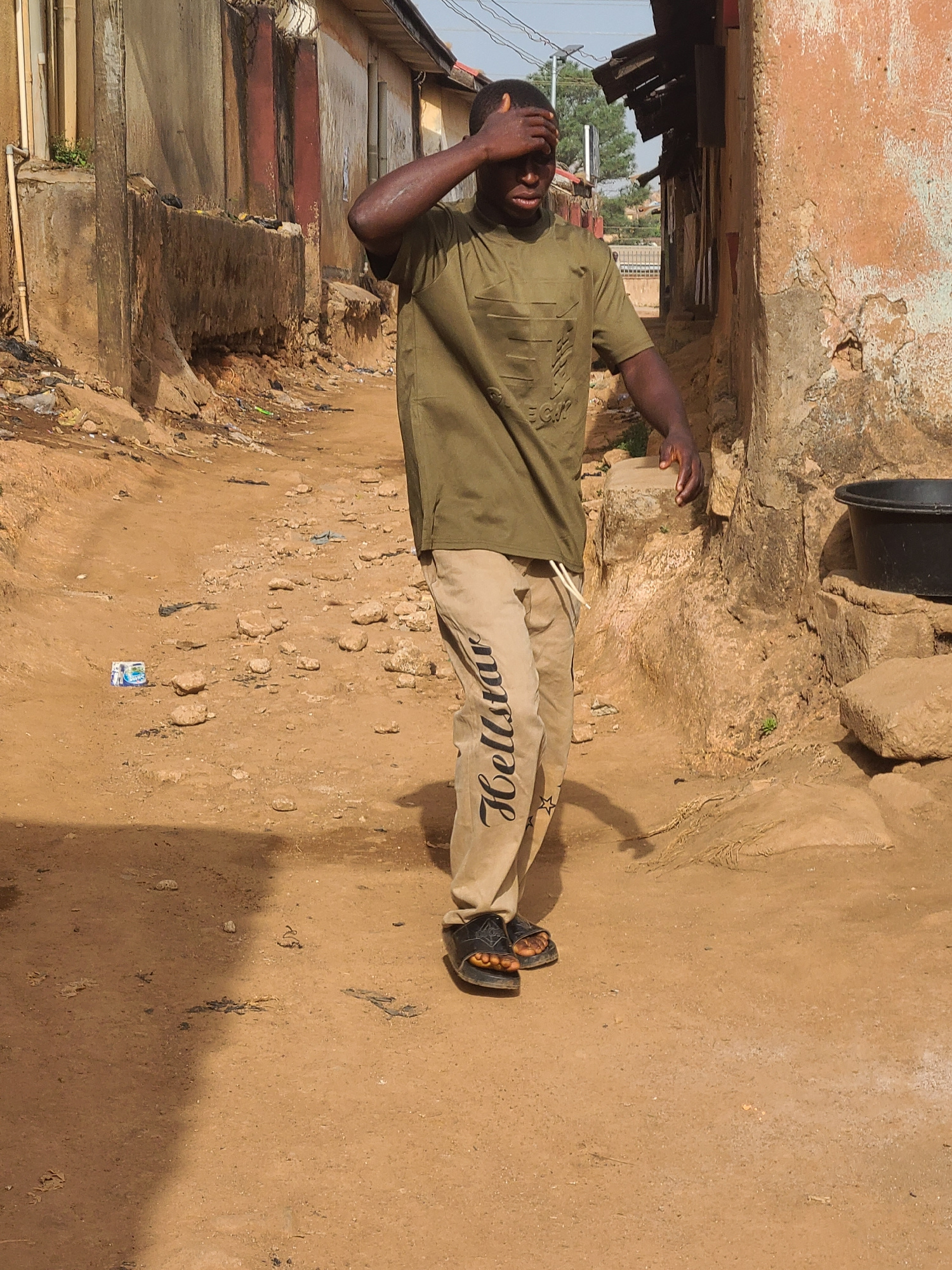 A medium-shot captures a man outdoors. He is wearing an olive-green shirt and khaki pants, with the word "Hollstar" printed on the side of his pants. He also wears dark sandals. His right hand is on h…read more