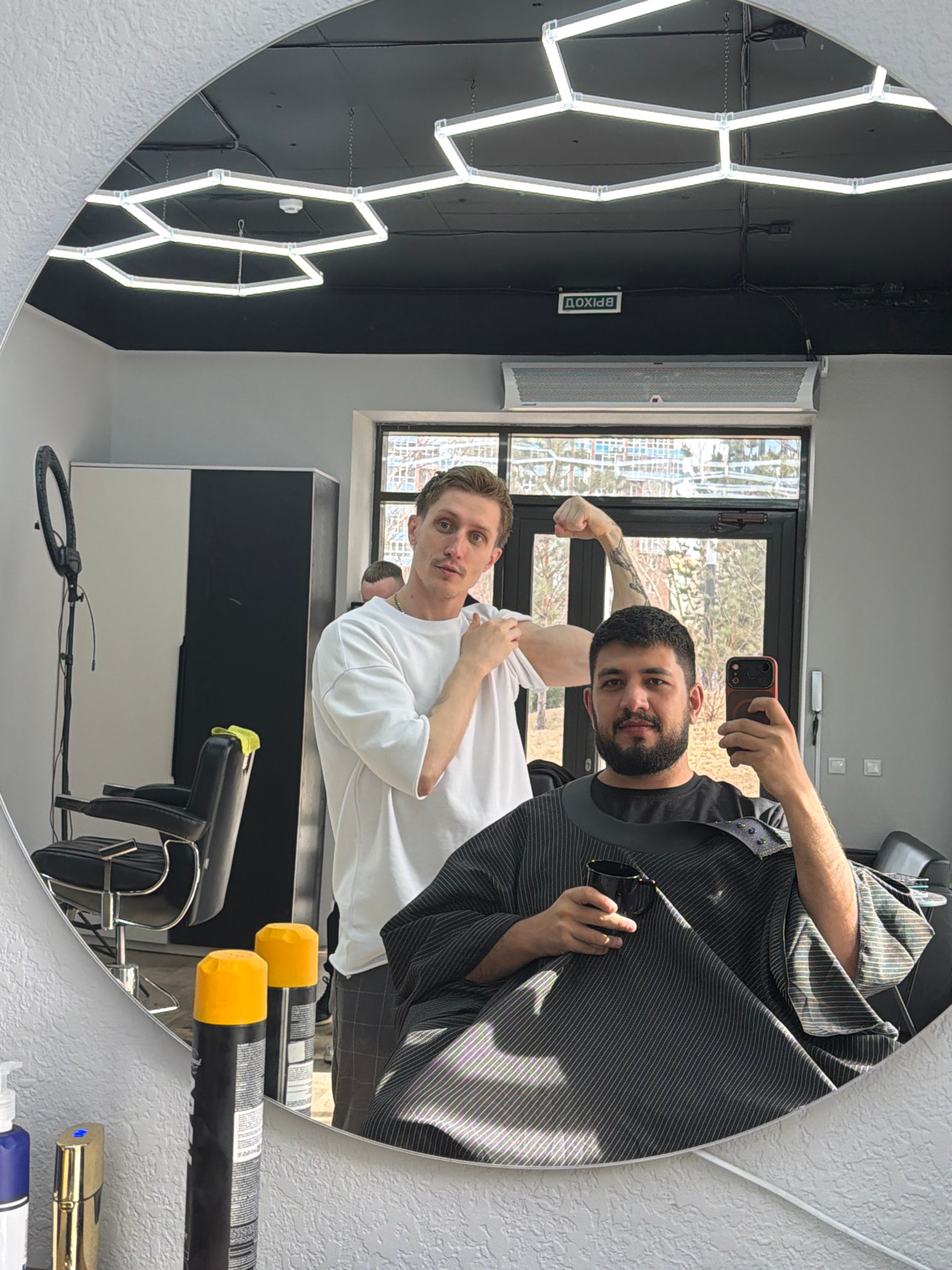 A man takes a selfie in a circular mirror in a barber shop. The man in the reflection on the right holds a phone and looks at the camera. He has short dark hair, a beard, and is wearing a dark-striped…read more