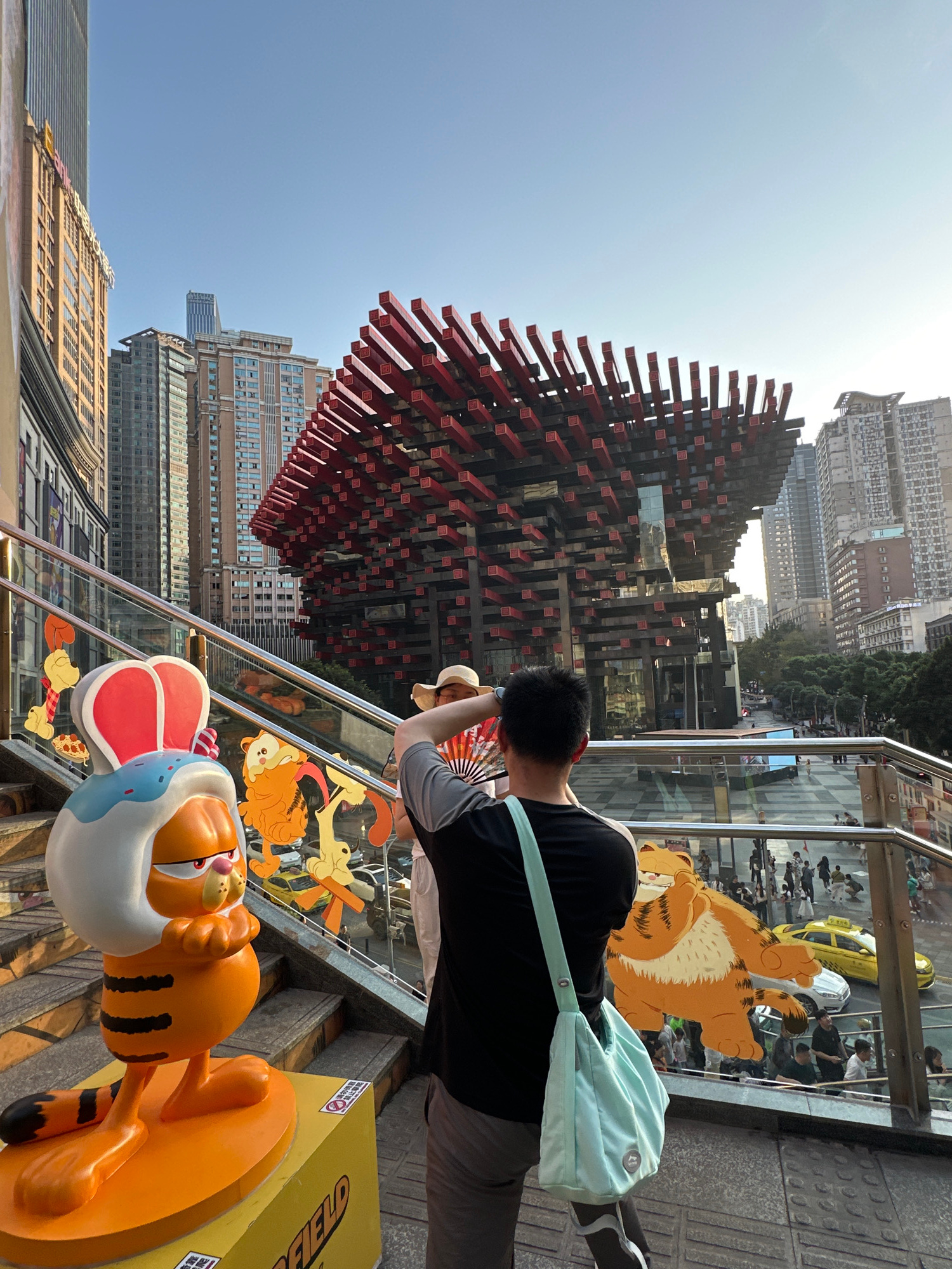 A medium, outdoor, canted, eye-level shot depicts a man taking a picture of Raffles City Chongqing in Yuzhong District, China. The man wears a black shirt, grey pants, and a pale green shoulder bag.…read more