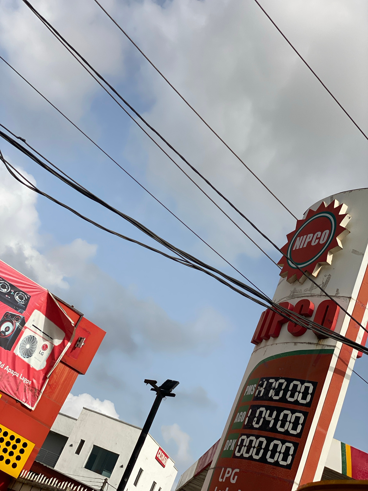 The image captures a street scene in Ado, Nigeria, looking upwards at a NIPCO gas station sign. The sign displays the price of PMS at 170.00, AGO at 104.00, and DPK at 000.00. Electrical wires crisscrβ¦read more