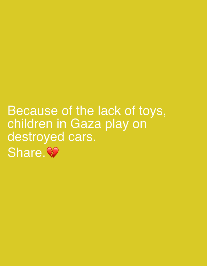The image is a yellow background with white text that reads: "Because of the lack of toys, children in Gaza play on destroyed cars. Share." A broken heart emoji is placed after the word "Share."