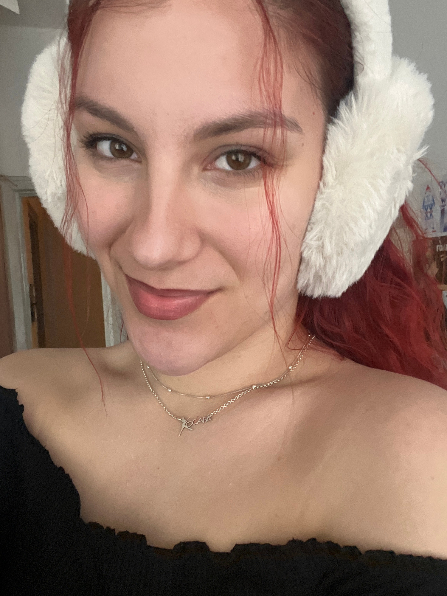 A close-up portrait of a fair-skinned woman with red hair, wearing white earmuffs and a black top. She has brown eyes and is wearing a silver necklace. The background appears to be an indoor setting.…read more