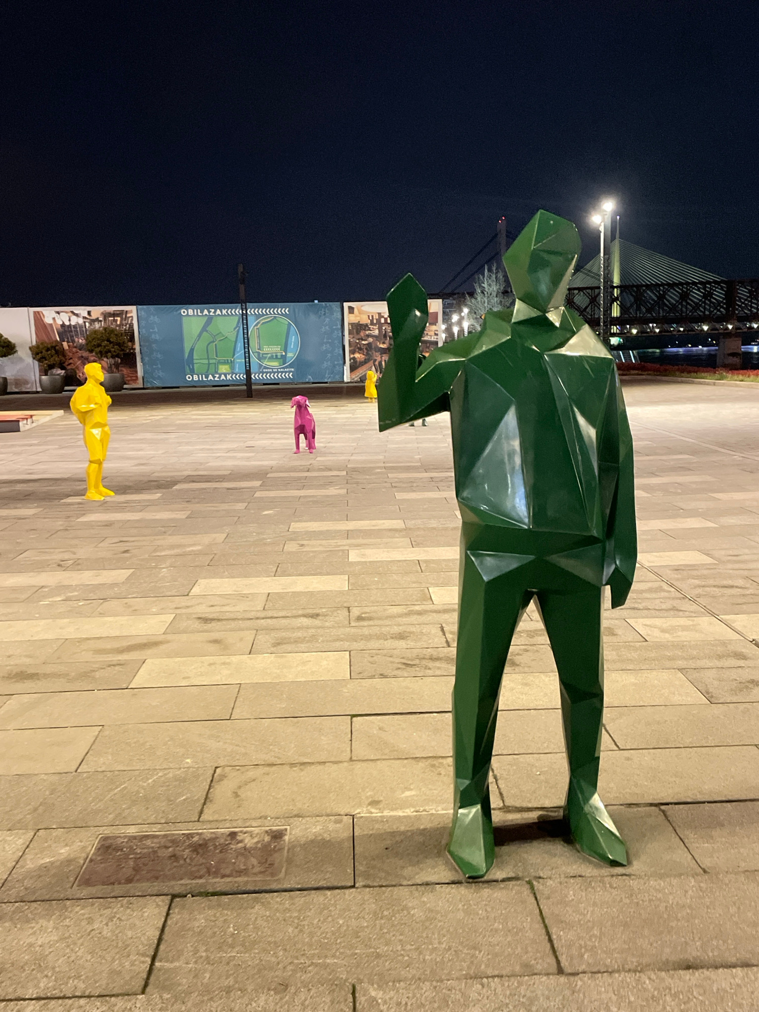 The image captures an outdoor scene in Belgrade, Serbia, featuring a green, angular sculpture of a crouching human figure in the foreground. The ground is paved with rectangular stones. In the backgro…read more