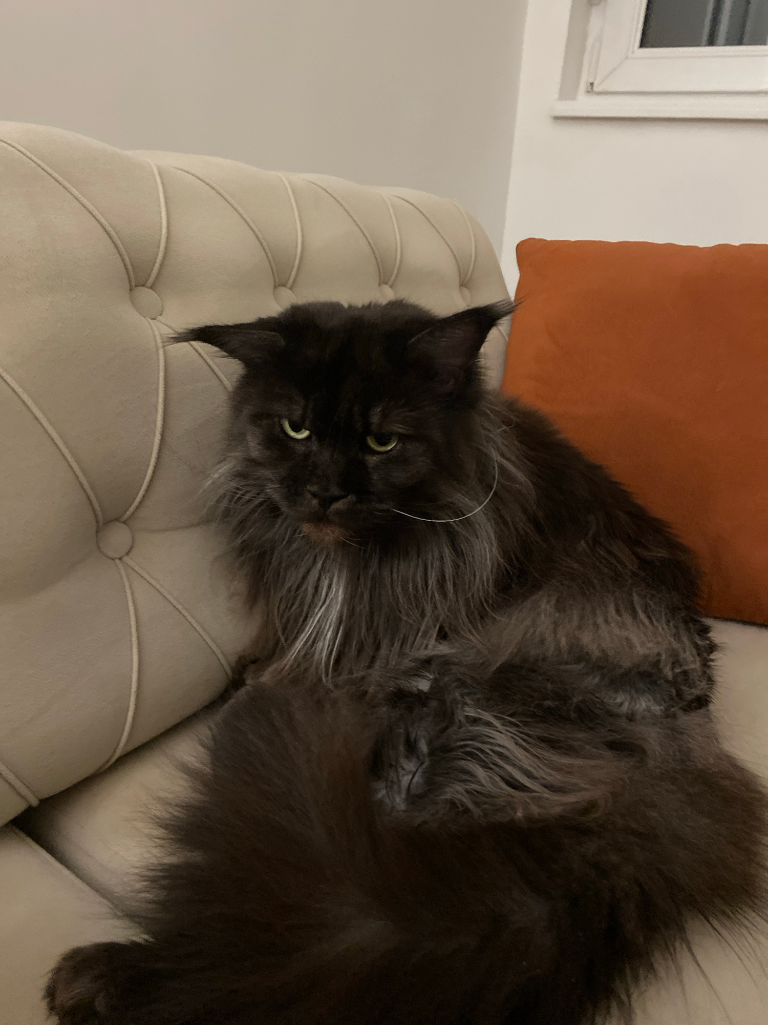 A large, dark-furred cat with long whiskers is lying on a beige tufted sofa. An orange pillow is visible behind the cat. The background includes a window frame and a light-colored wall. The location i…read more