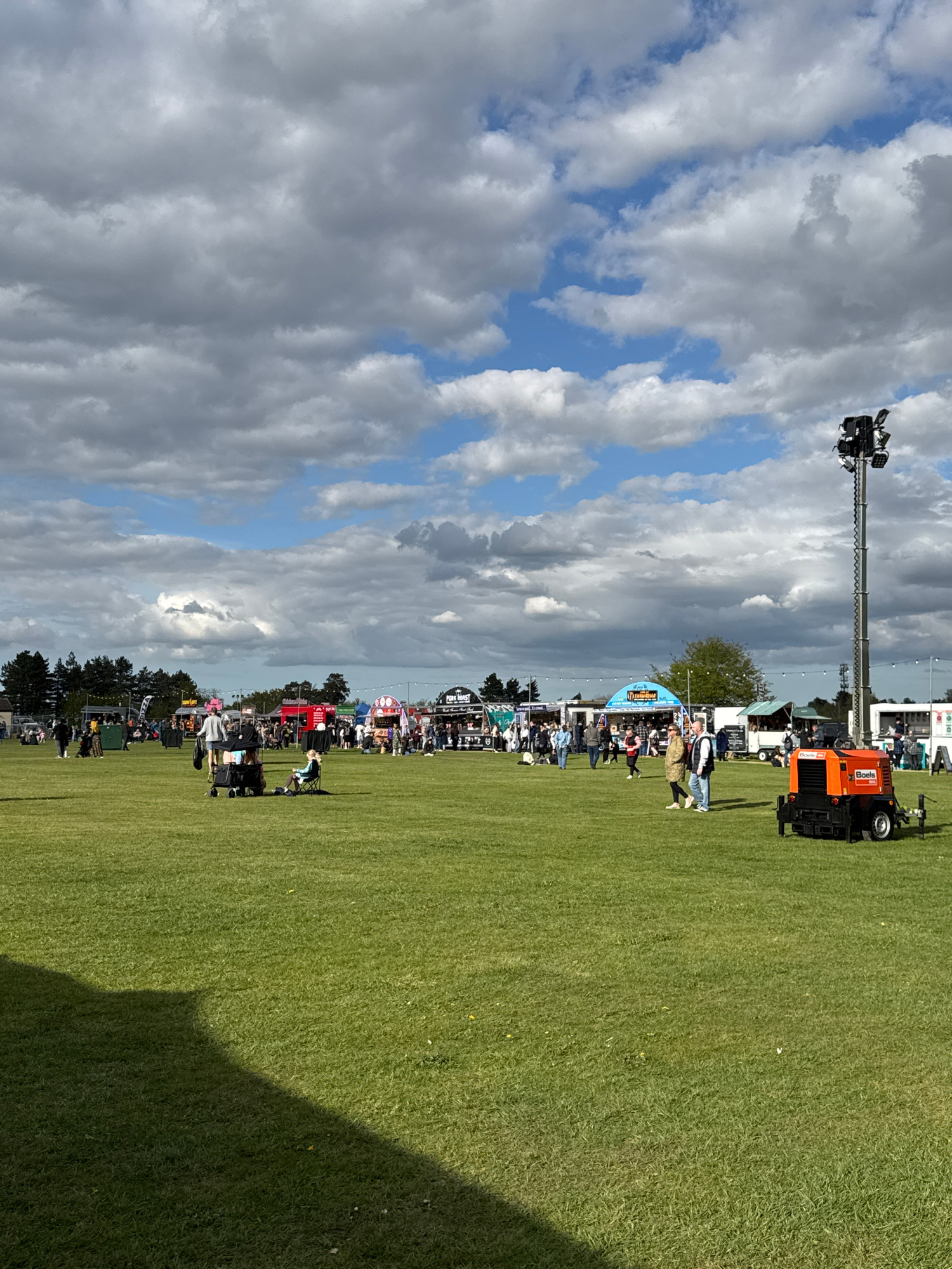The image shows an outdoor event taking place on a large green field. A crowd of people are gathered. An orange Boels truck with a high-reach lighting rig is parked at the edge of the field. Overcast…read more
