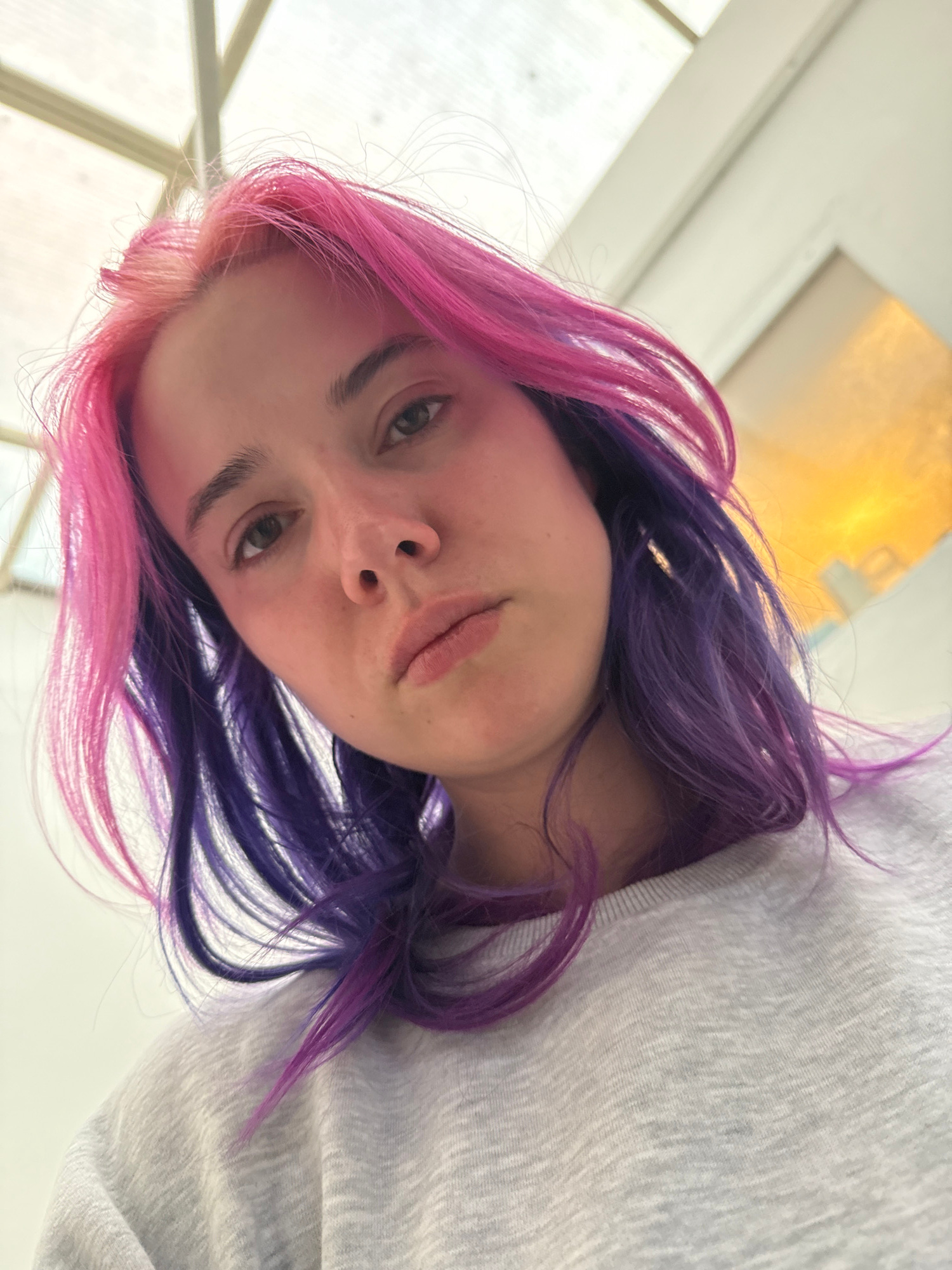 A young woman with pink and purple hair is looking down at the camera. She is wearing a light grey sweatshirt. The background shows a window with sunlight streaming in. The location cannot be determin…read more