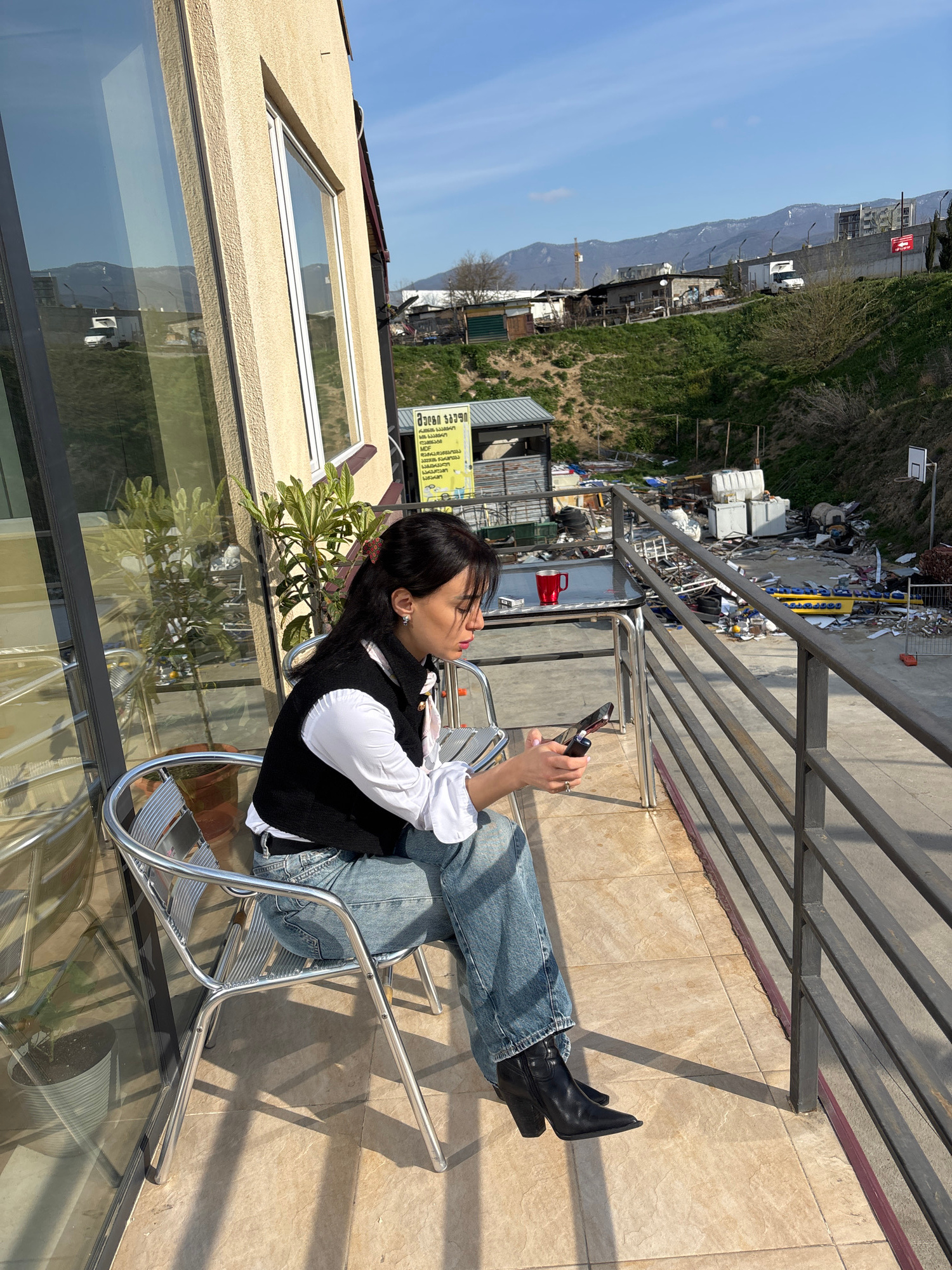 The image depicts a young woman relaxing on a sunlit balcony in Tbilisi, Georgia. She is seated on a modern, chrome-colored metal chair, facing away from the camera, with her legs crossed. She wears a…read more