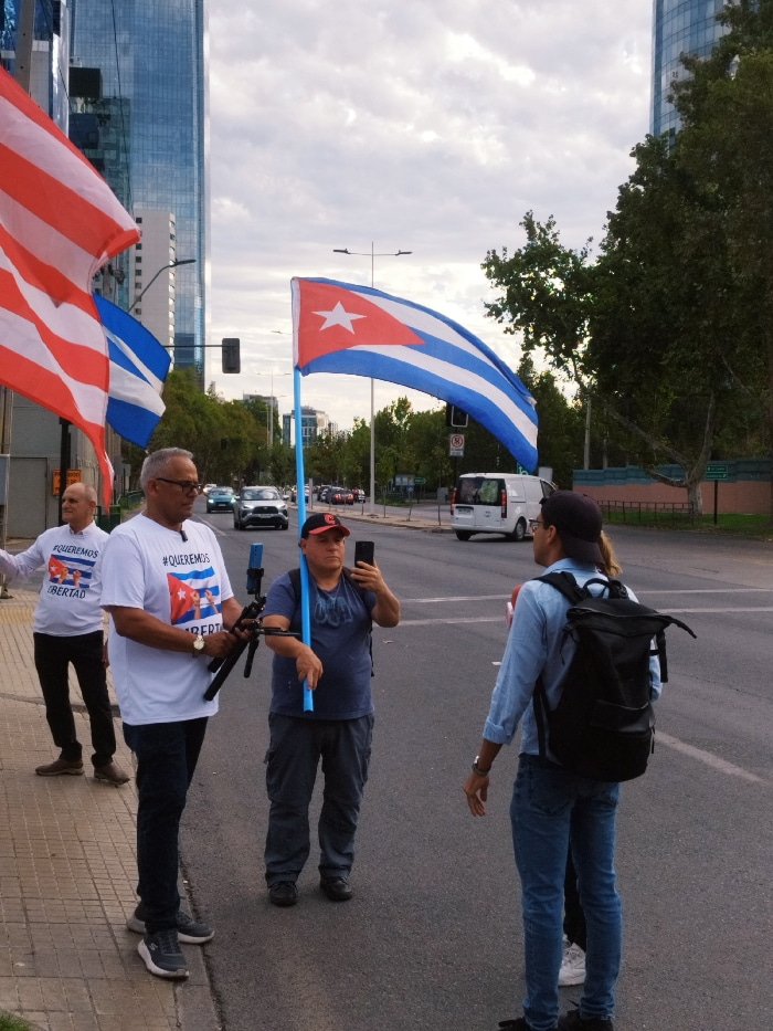 Four individuals are gathered on a city street. Three men hold Cuban and Puerto Rican flags. One man is taking a photo with his phone. Another is wearing a white t-shirt with the words "Queremos liber…read more