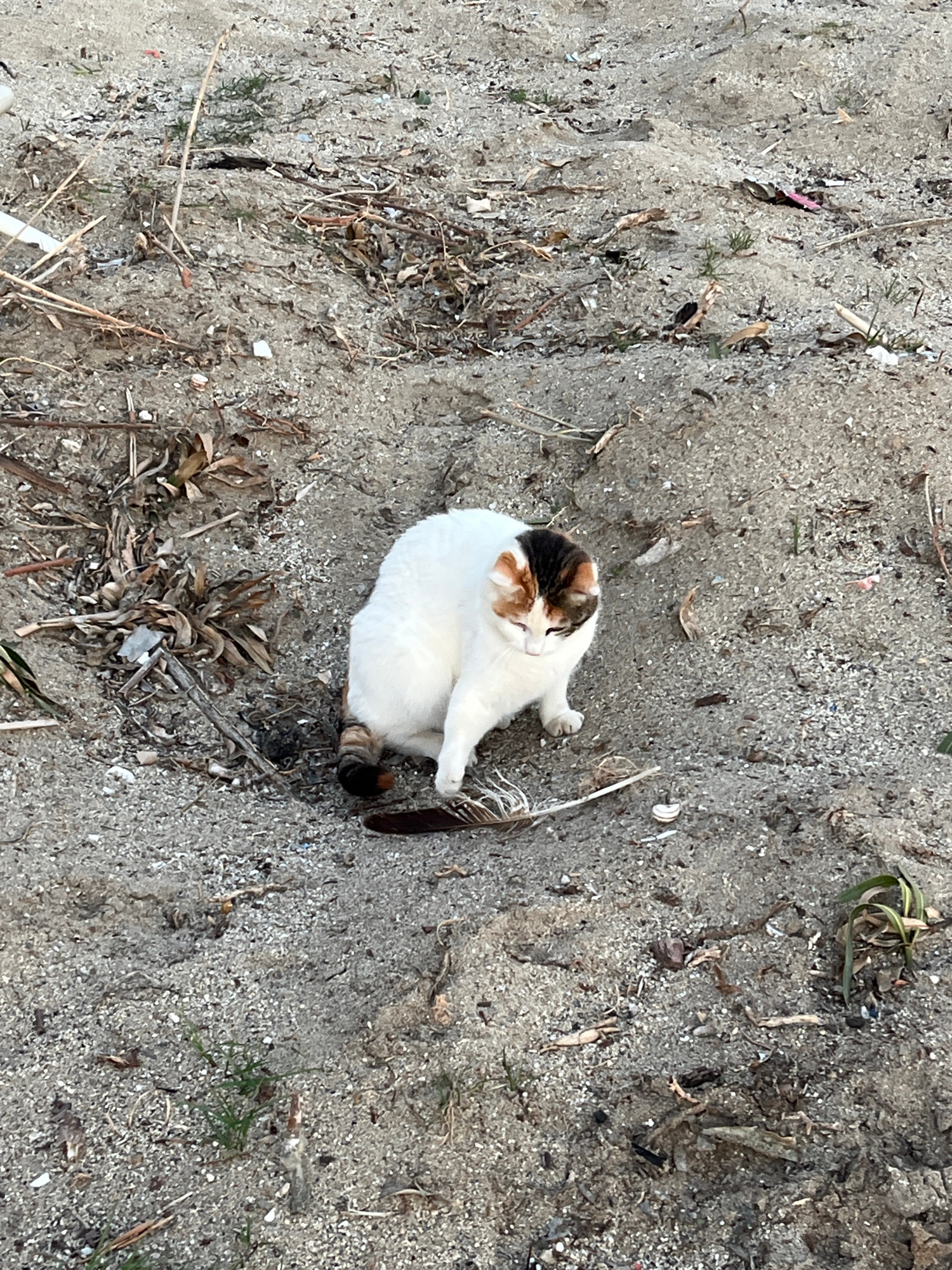 A white, calico-spotted cat is grooming itself in a sandy, somewhat barren environment. There is debris scattered throughout the sand, including twigs, leaves, and a feather. The location is possibly…read more