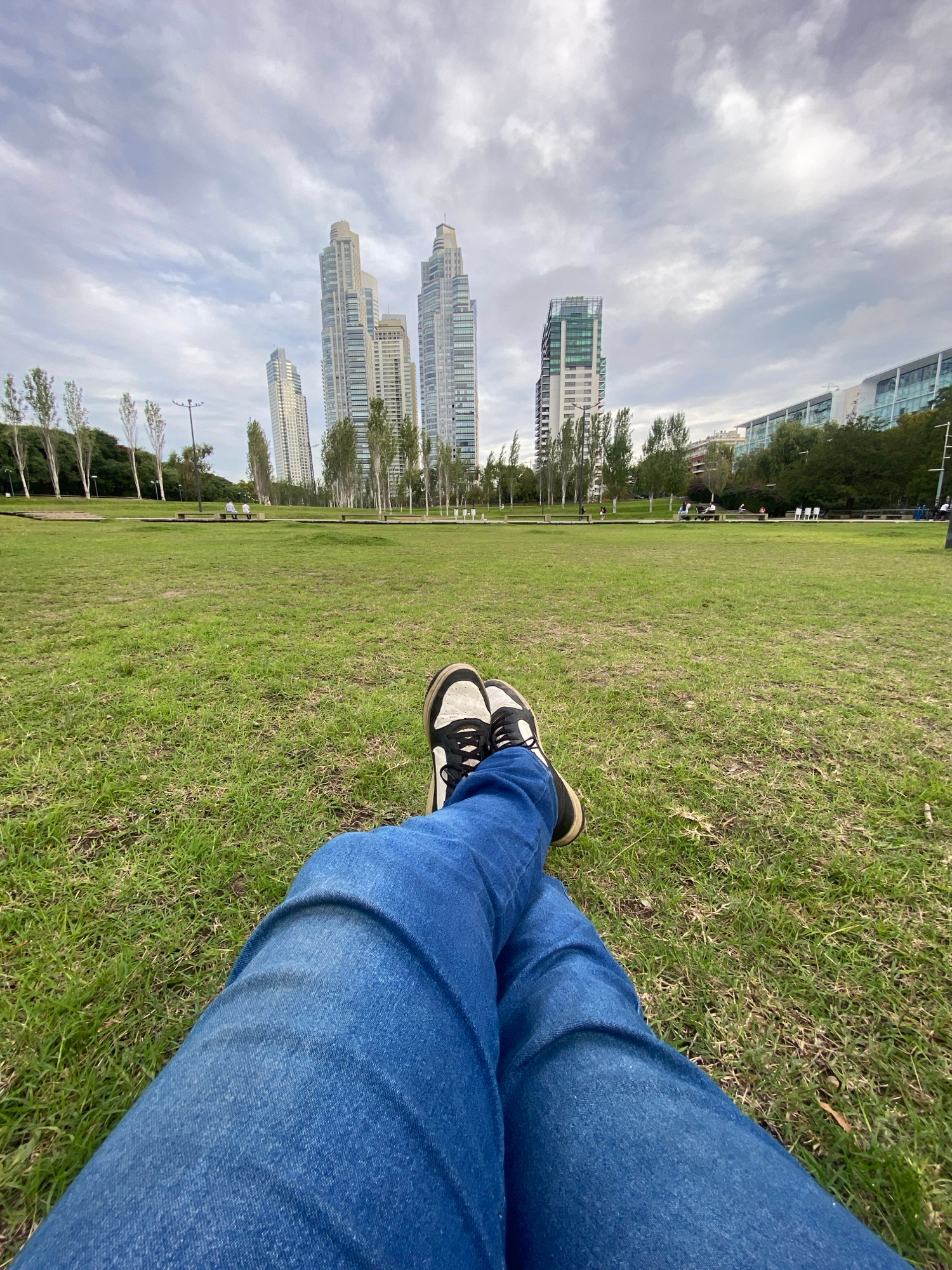 A person wearing blue jeans and black and white sneakers is sitting on a grassy lawn. In the background, there is a view of modern buildings and skyscrapers, a characteristic feature of Puerto Madero…read more