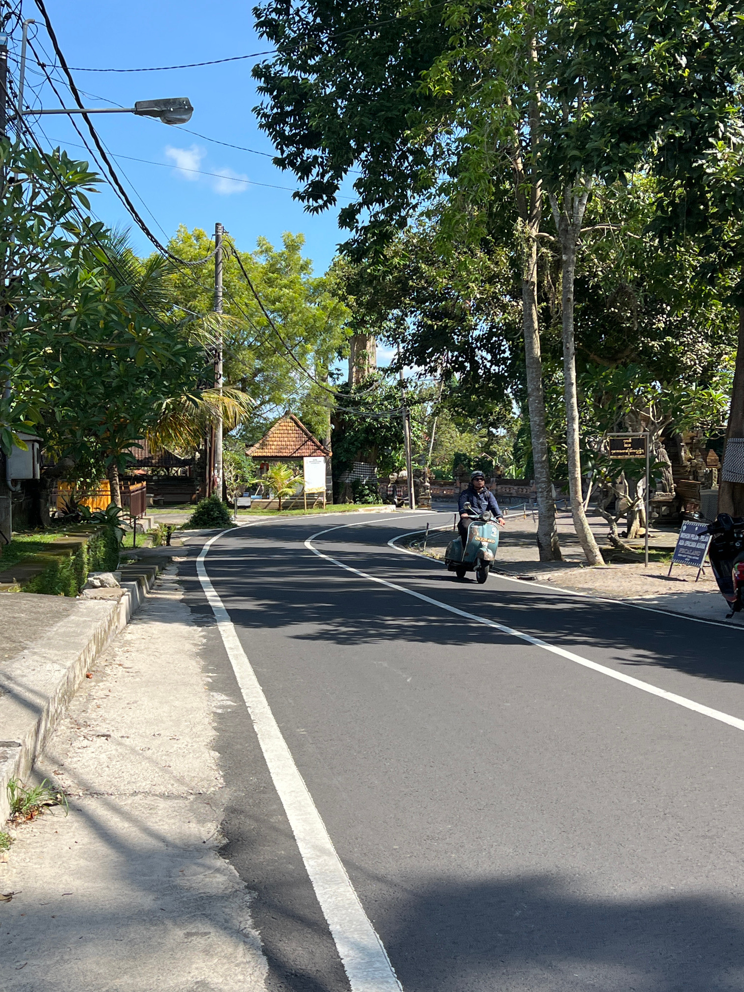 A sunlit road scene in Petulu, Indonesia shows a man on a scooter driving to the right with the scooter positioned on the white line. Lush greenery lines the road on both sides with power lines visibl…read more