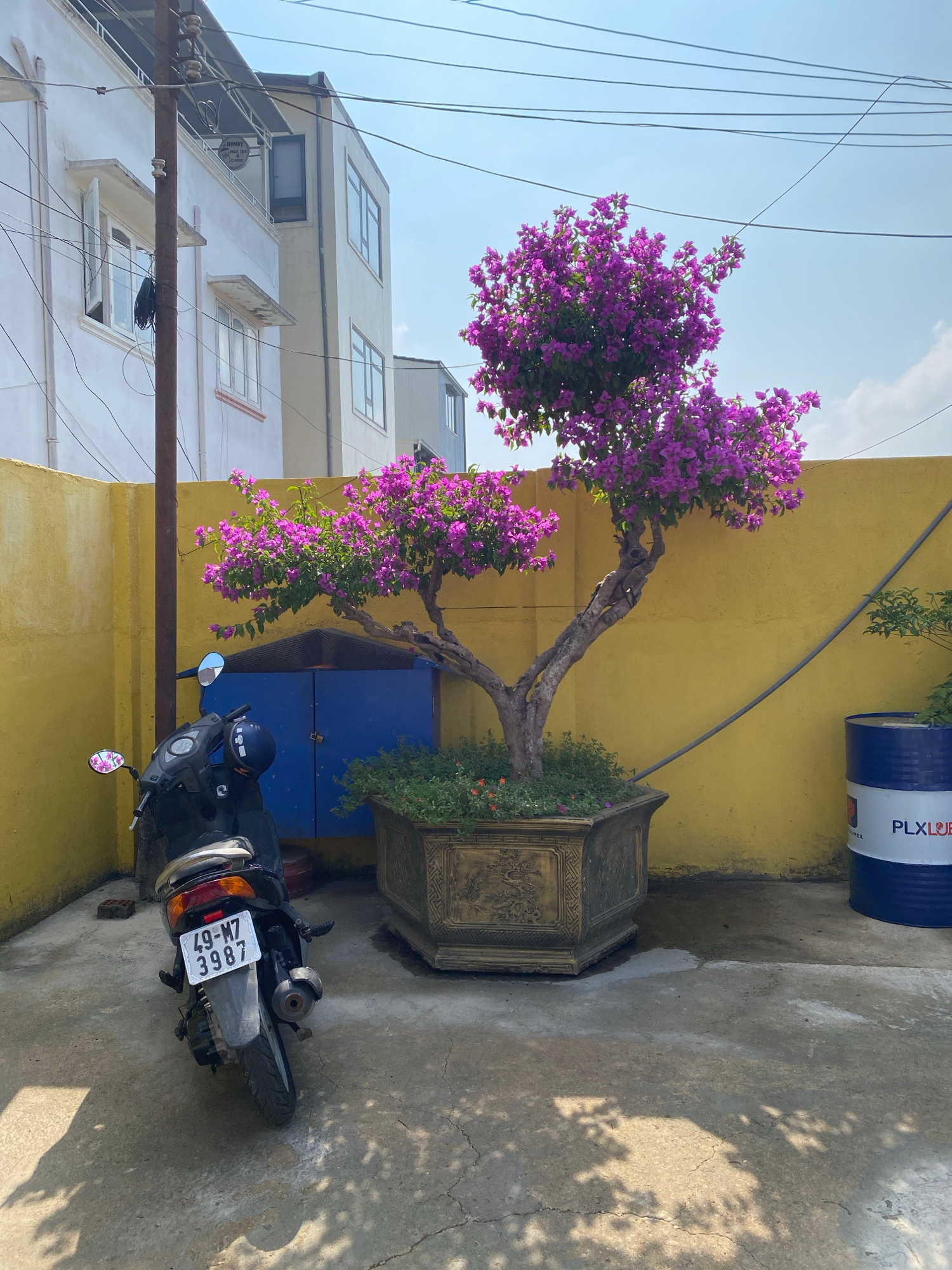 The image shows a street scene in Lam Vien - Da Lat, Vietnam. A potted bougainvillea tree with vibrant purple flowers stands against a yellow wall. A parked black motorcycle is positioned next to the…read more