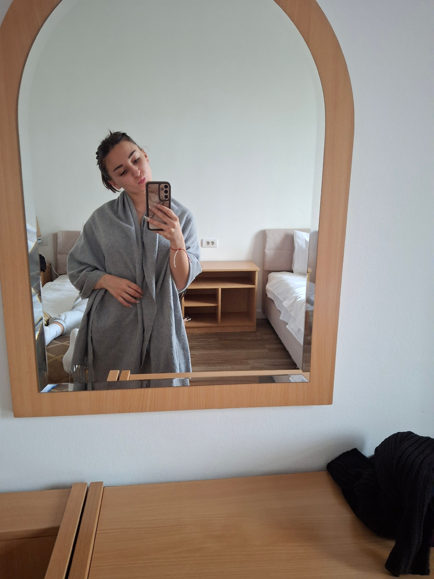 The image presents a candid scene within a bedroom in the city of Vozdovac Urban Municipality, Serbia. A young adult female is visible in the reflection of a large, vertically oriented mirror with a lā¦read more