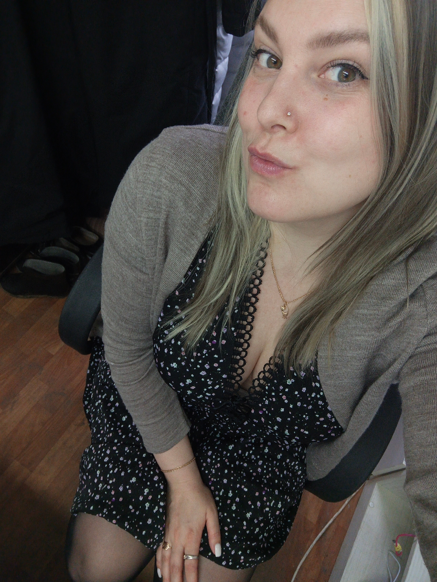A young woman with light blonde hair and brown eyes poses for a selfie. She is wearing a black floral dress, a light brown cardigan, and black tights. A gold necklace and rings are visible. She is sit…read more