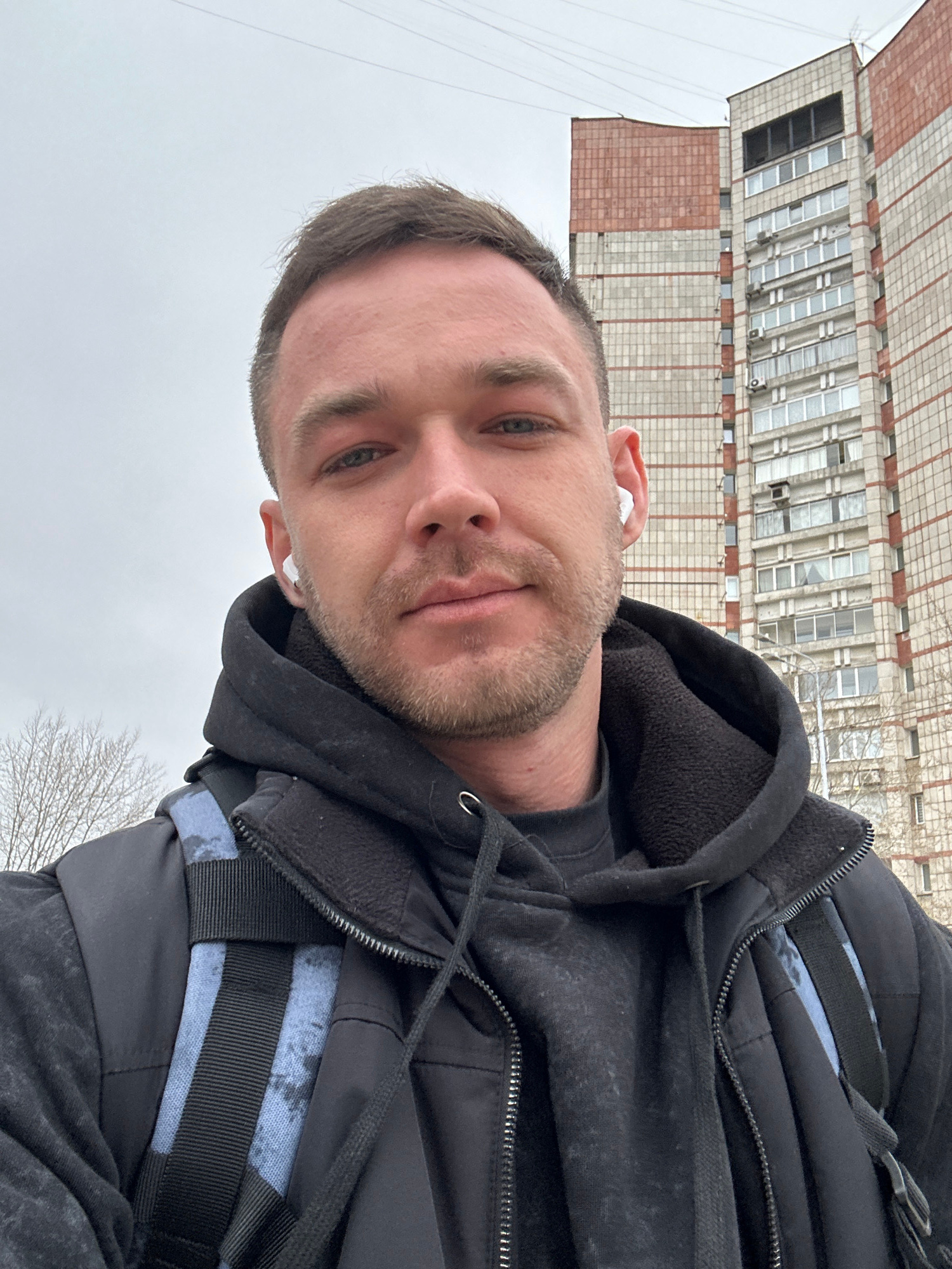 A selfie taken by a light-skinned male in Perm, Russia. He has short brown hair, blue eyes, and light stubble. He is wearing a black hooded sweatshirt and a black jacket with straps. He has white wireβ¦read more