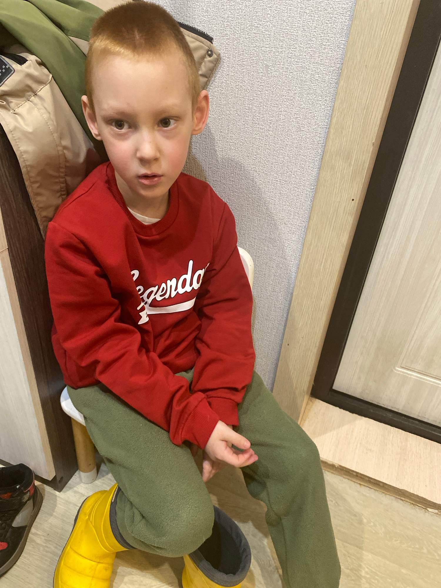 A young boy is sitting on a brown wooden shelf with a jacket underneath him. He is wearing a red sweatshirt with the word "legendary" on it and green sweatpants. His feet are clad in yellow rain boots…read more