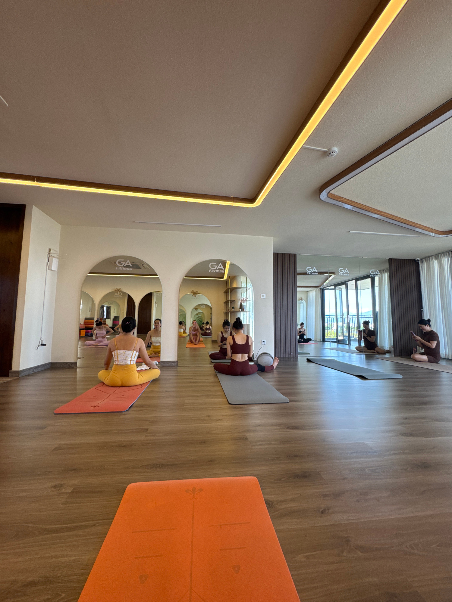 This image depicts the interior of a yoga studio, located in an unknown city. The studio features hardwood flooring. Several individuals are engaged in yoga poses on yoga mats, positioned on the floor…read more