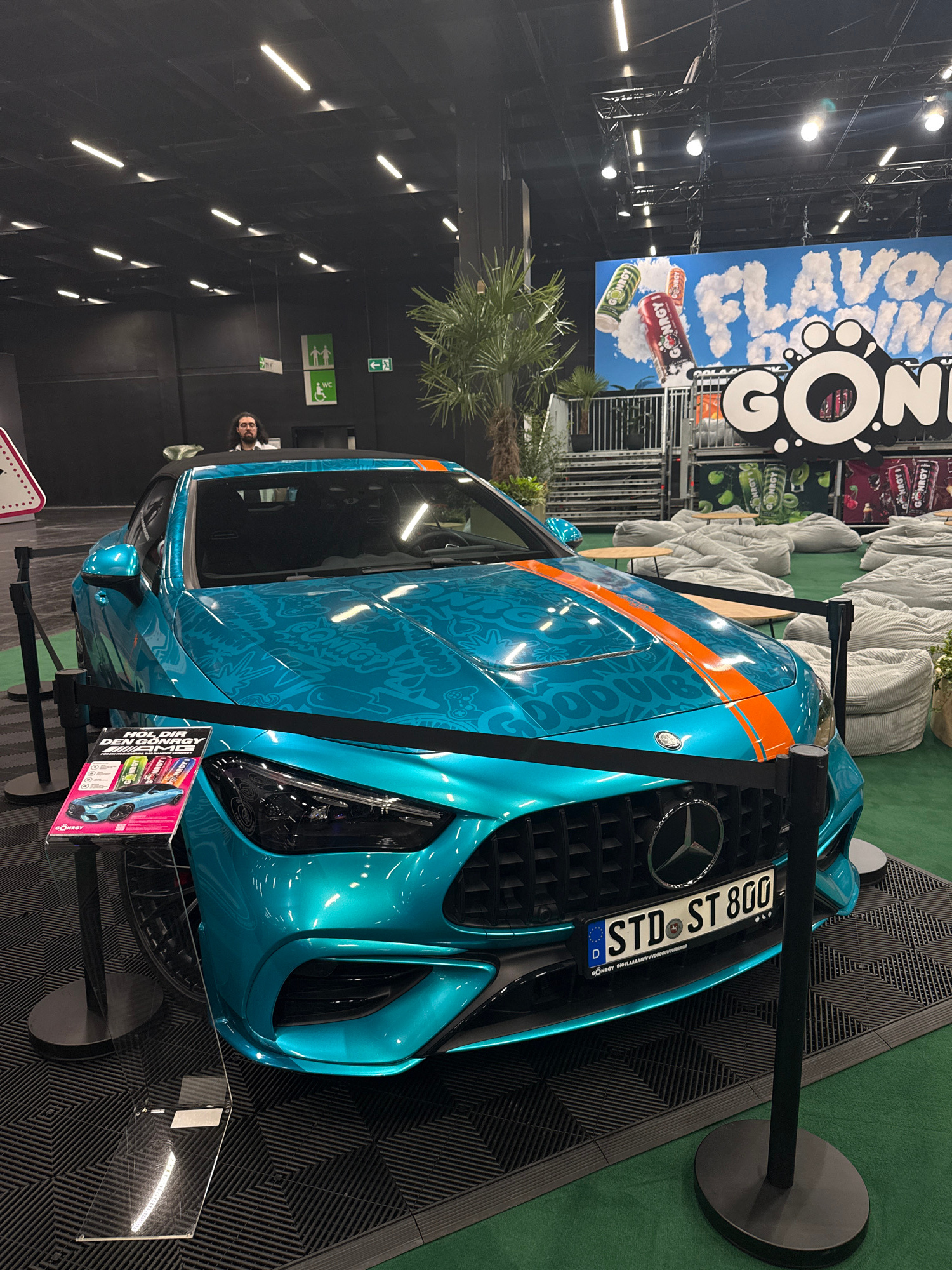 The image presents a customized, teal-colored Mercedes-AMG car showcased at an event, likely an exhibition or a promotional setting. The car's hood and roof display a distinct orange racing stripe and…read more