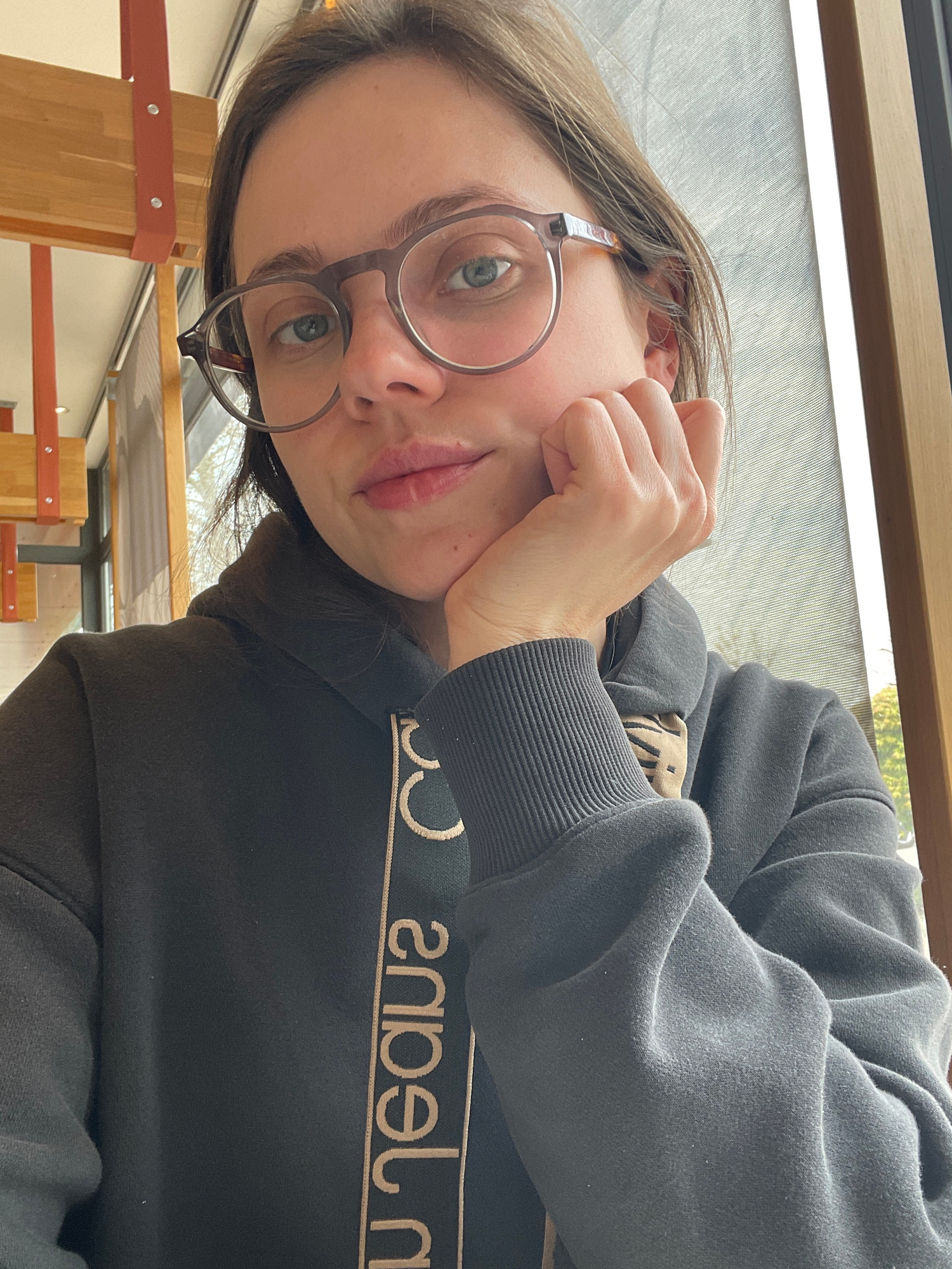 The image is a close-up, angled selfie of a woman with fair skin and brown hair, wearing round glasses. She is wearing a gray hooded sweatshirt. Her face is resting on her hand. The background suggest…read more