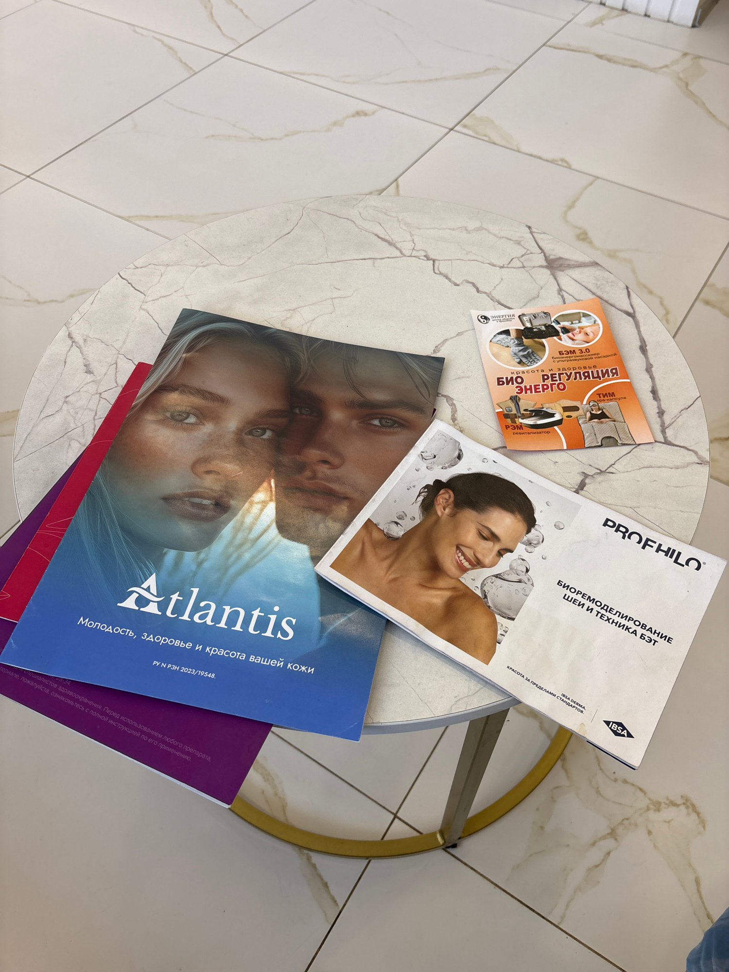 The image depicts a top-down view of a small, round table with a marble-like top, placed indoors. The table legs are partially visible, featuring a gold-colored ring. On the table, there are four broc…read more